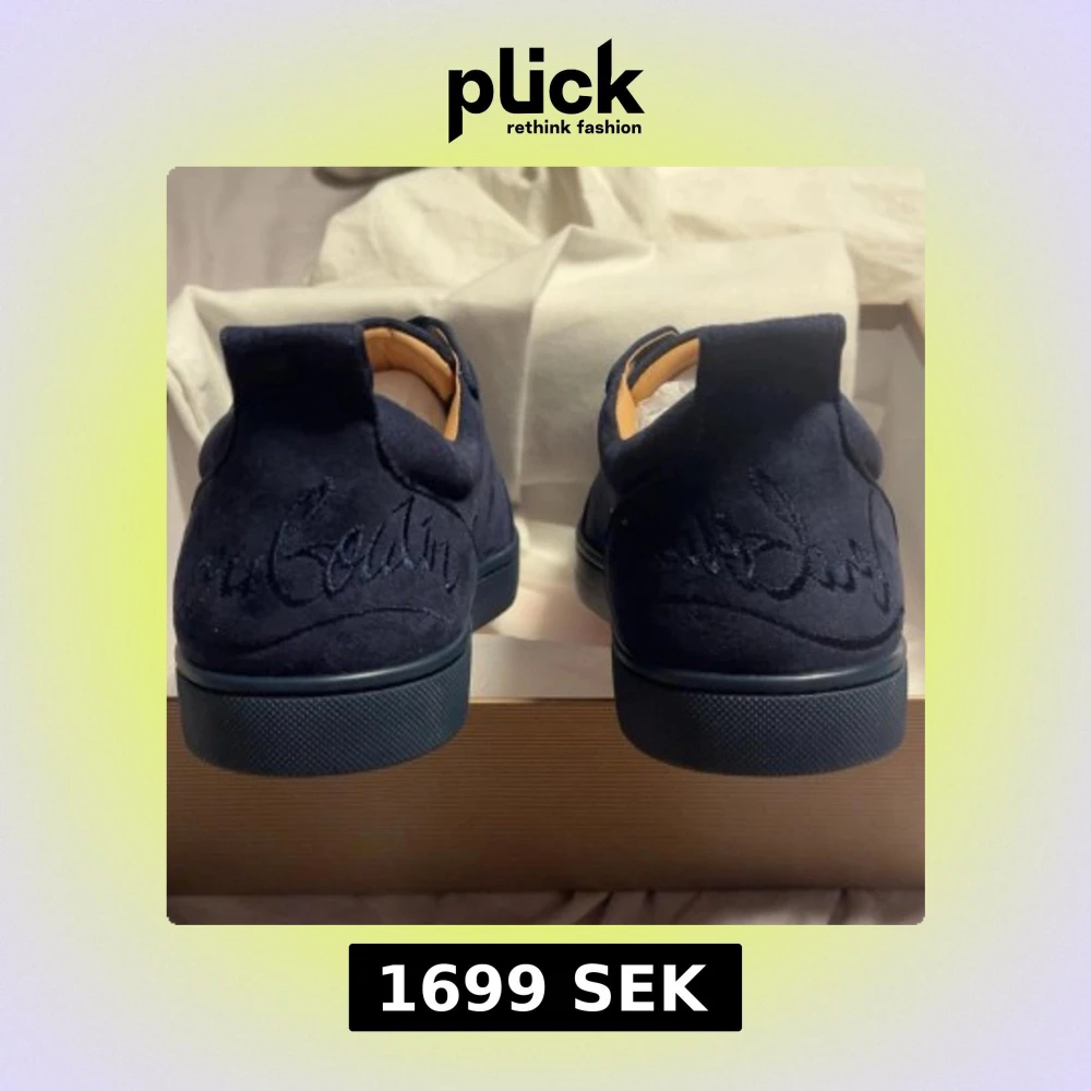 Snygga mörkblå sneakers i mocka från Christian Louboutin med den ikoniska röda sulan. Skorna har diskret snörning och broderad logotyp på hälen. Perfekta för att ge en lyxig touch till din stil.