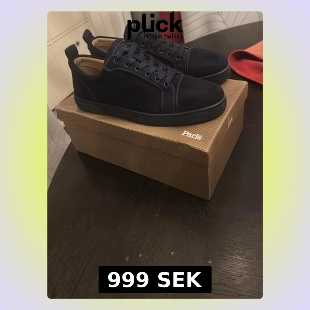 Säljer ett par stilrena mörkblå sneakers från Louboutin med klassisk röd sula och snygg snörning. Skorna är tillverkade i mocka och har rund tå samt platt sula. Perfekt för dig som gillar exklusiva detaljer och vill sticka ut med en lyxig touch.