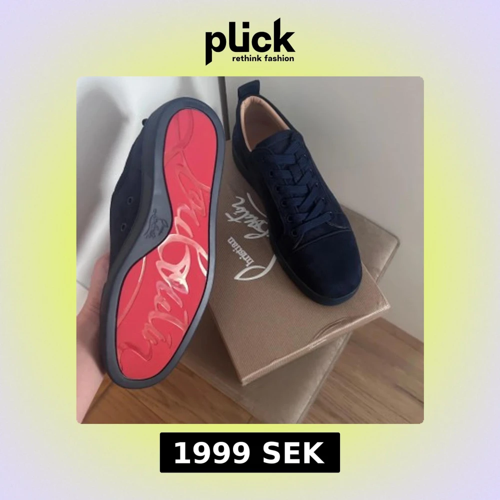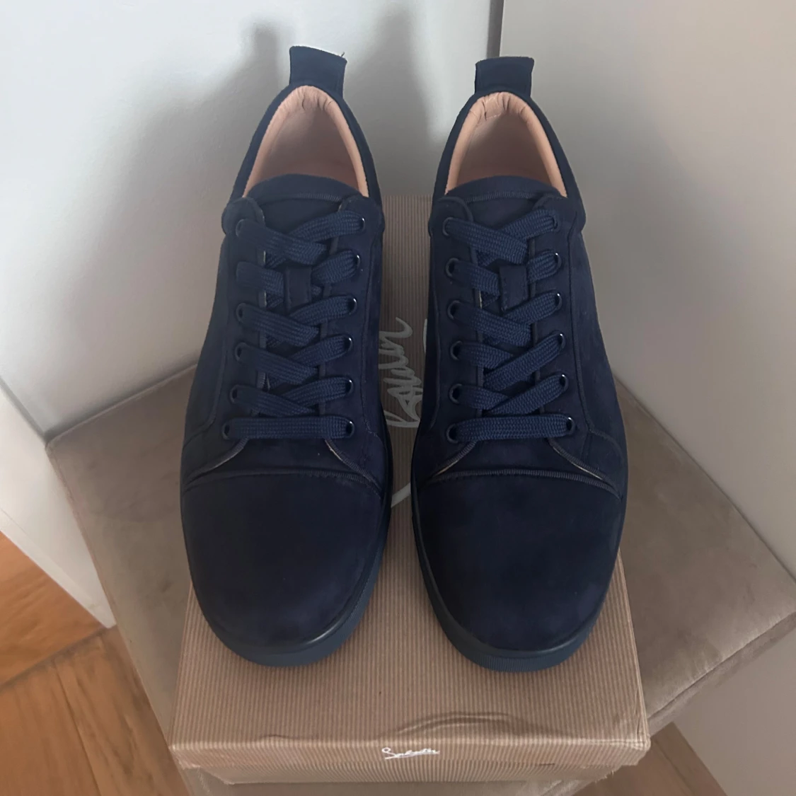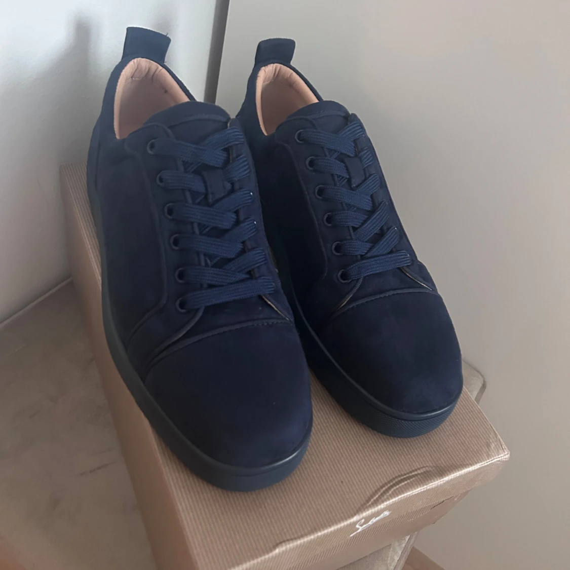 Säljer ett par mörkblå sneakers från Christian Louboutin med klassisk röd sula och diskret logga på hälen. Skorna har snörning och är tillverkade i mocka med en stilren design. Perfekta för dig som vill ha något exklusivt och snyggt.