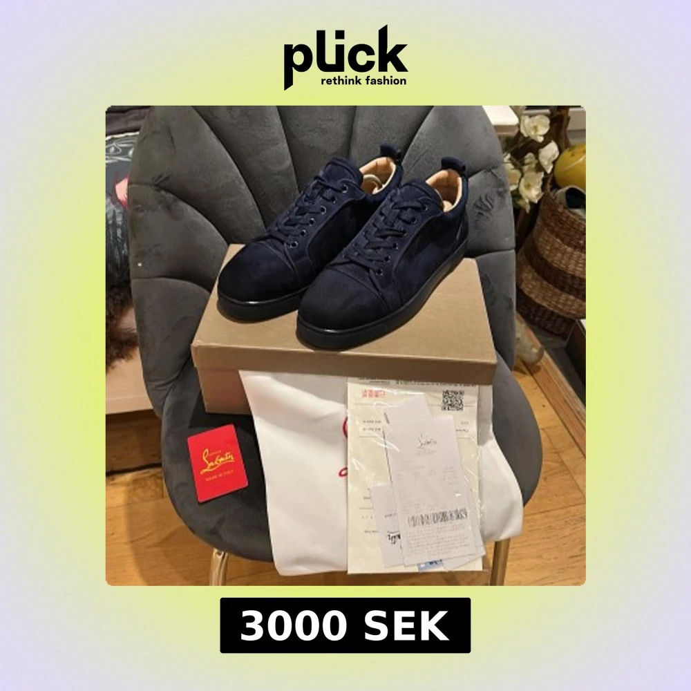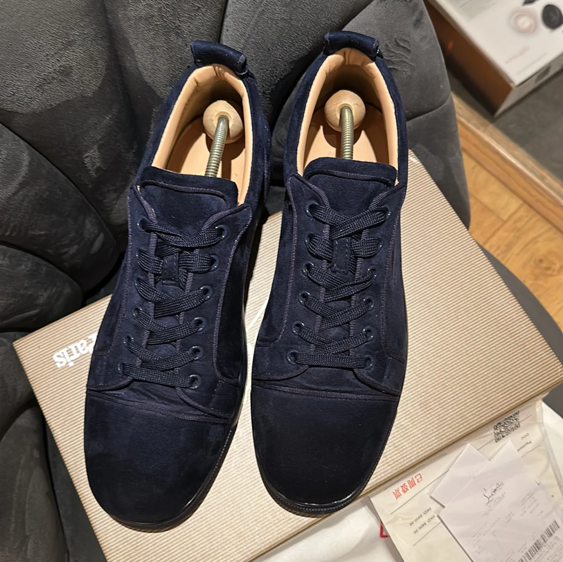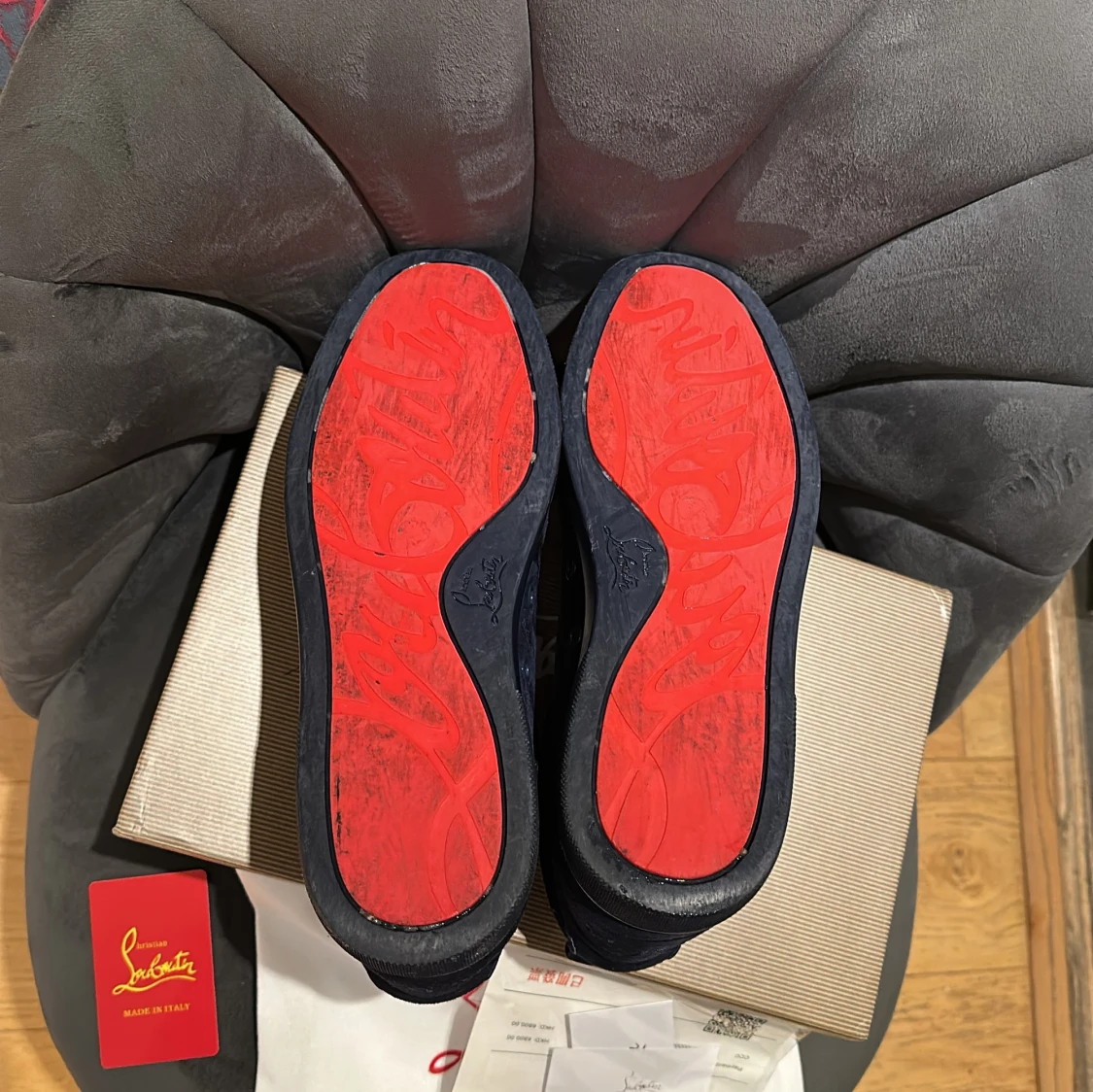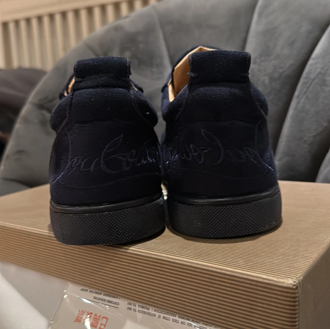 Snygga mörkblå sneakers från Christian Louboutin i lyxig mocka med klassisk snörning och ikoniska röda sulor. Skorna har rund tå och diskret broderad logga på hälen. Perfekta för dig som vill sticka ut med exklusiv stil.