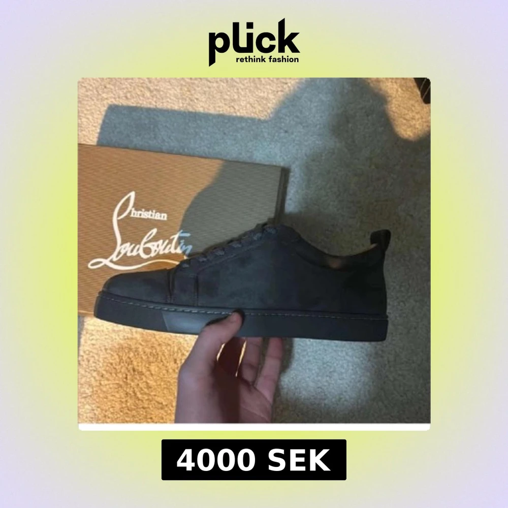 Säljer ett par svarta sneakers från Christian Louboutin med klassisk röd sula. Skorna har snörning och är tillverkade i mocka med en stilren och minimalistisk design. Perfekta för dig som gillar exklusiva och tidlösa skor.