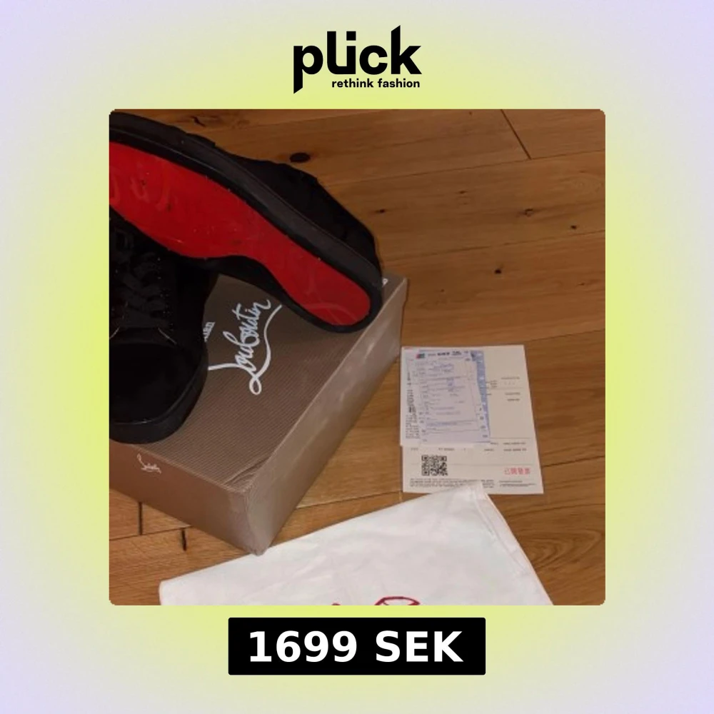Säljer ett par svarta sneakers från Louboutin med klassisk röd sula. Skorna har rund tå, platt sula och snörning. Ovandelen är i mocka och insidan är ljusbeige. Perfekt för dig som gillar exklusiv och stilren design. Vid snabb affär kan jag gå ner i pris.