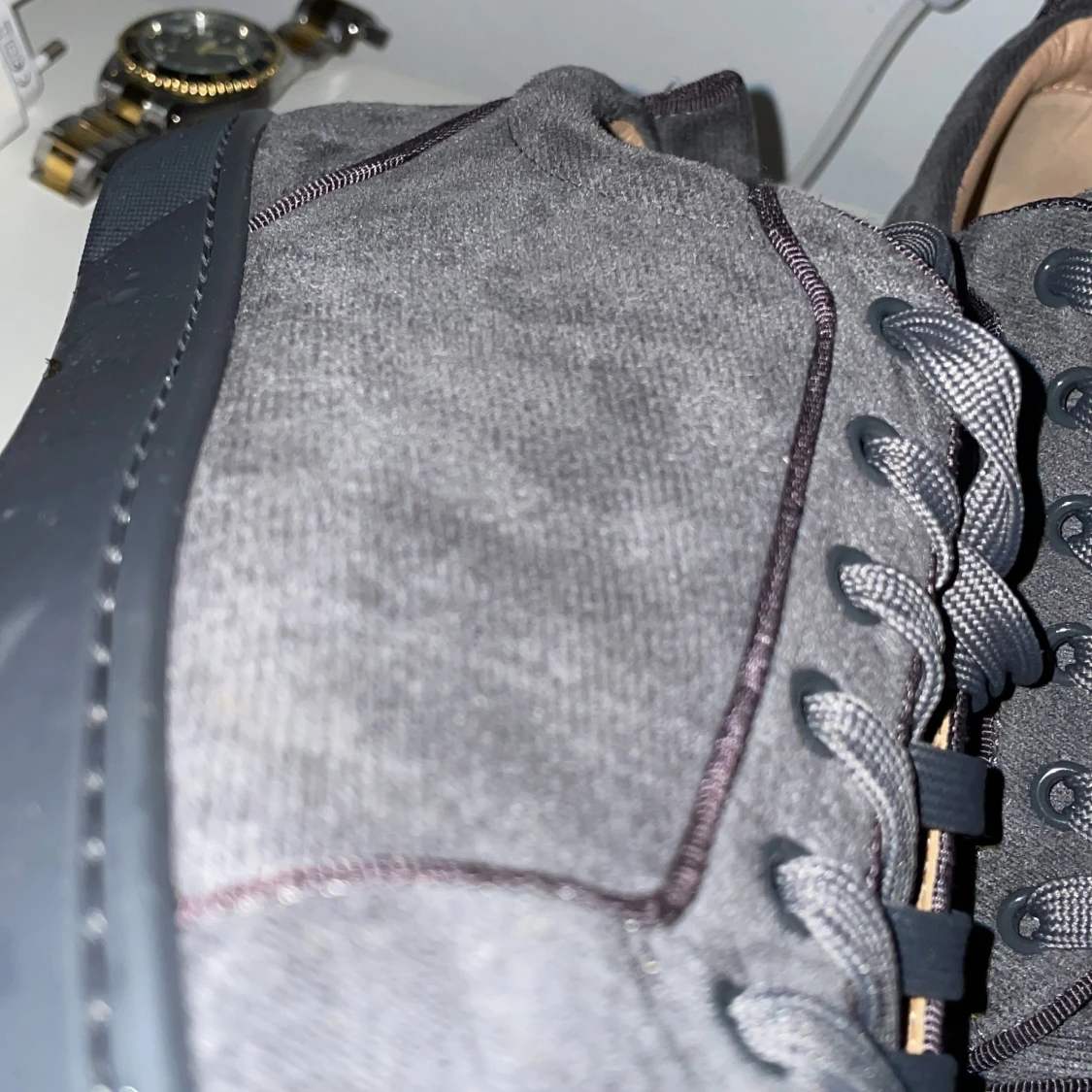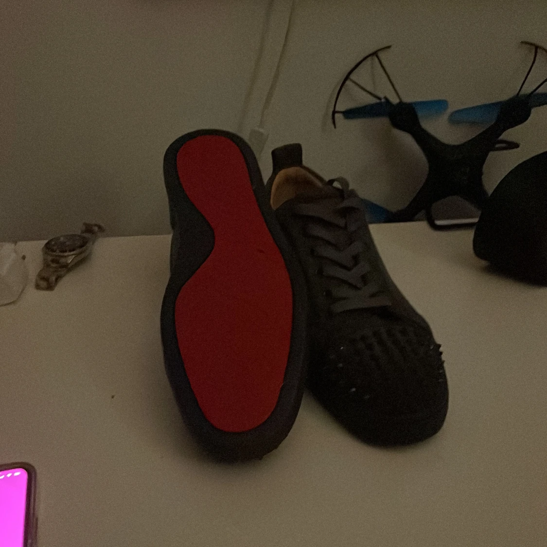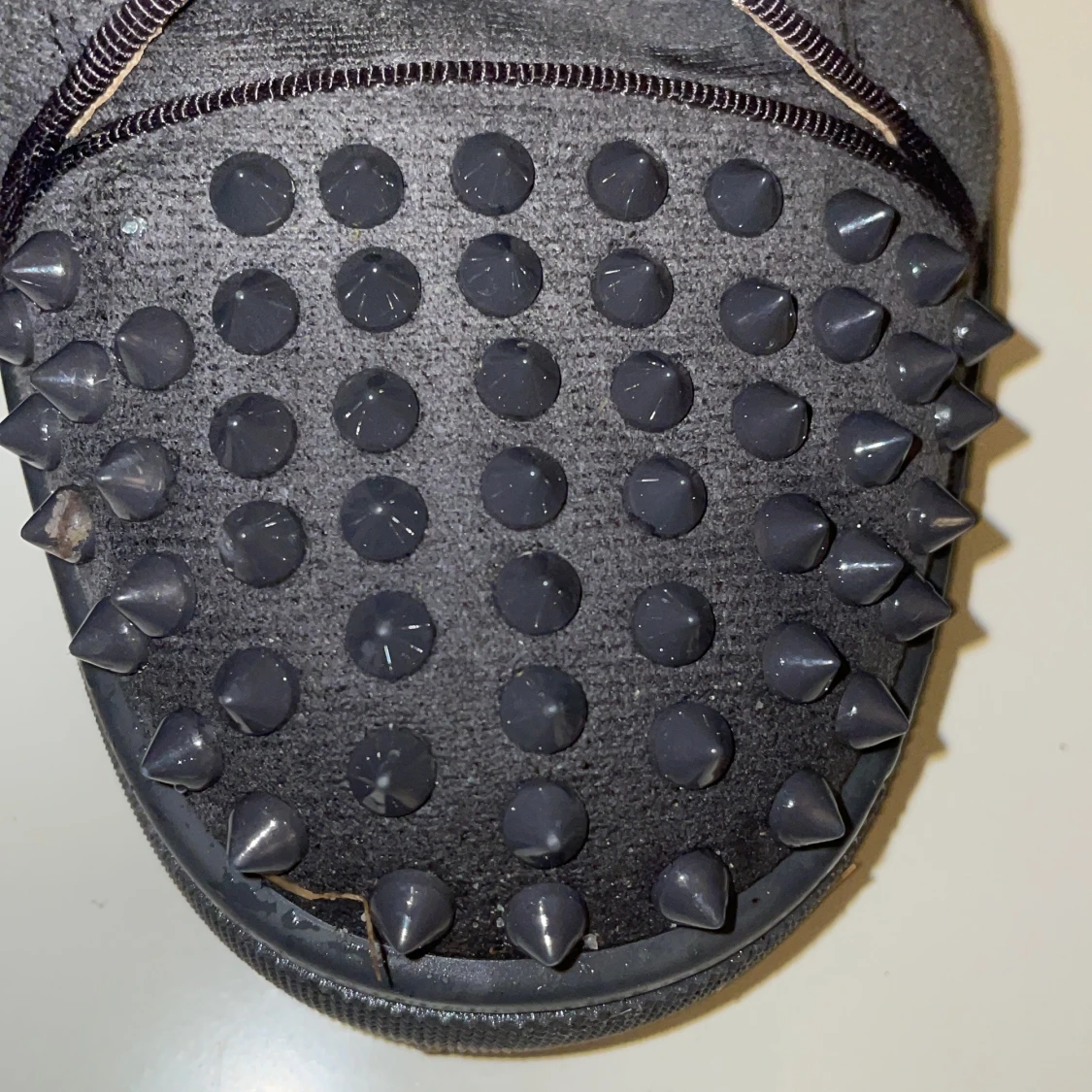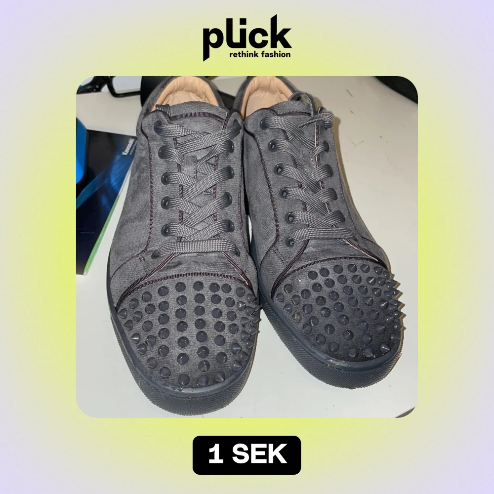 Säljer ett par svarta sneakers från Louboutin i mycket bra skick. Skorna har en cool design med nitar på tån och den klassiska röda sulan. Perfekta för att ge din outfit en edgy touch. De är i storlek herr 42-44 och har snörning för en bra passform.