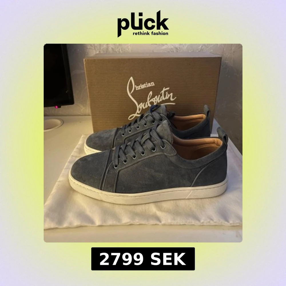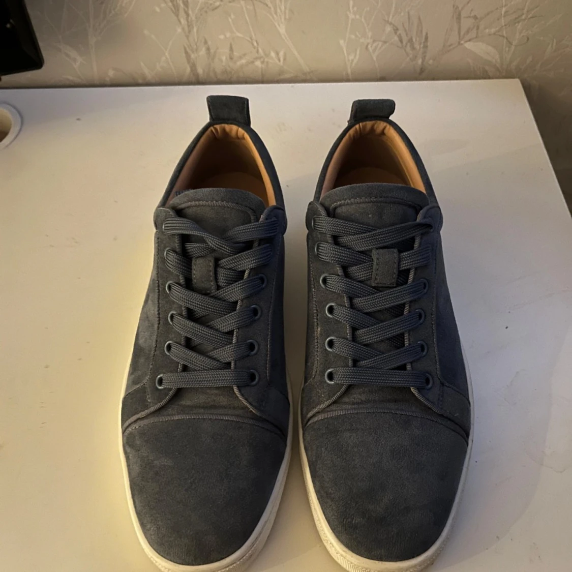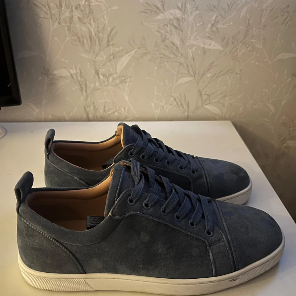 Säljer ett par snygga blå sneakers från Christian Louboutin i mocka. De har en klassisk design med snörning och en röd sula som ger en stilren look. Perfekta för både vardag och festliga tillfällen. Skorna är i mycket bra skick och kommer med originalkartong. Skorna är även äkta