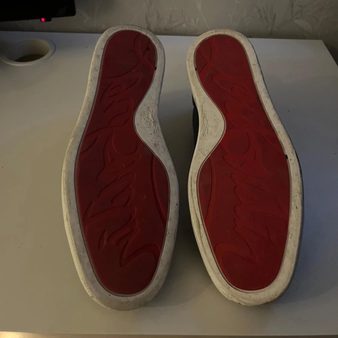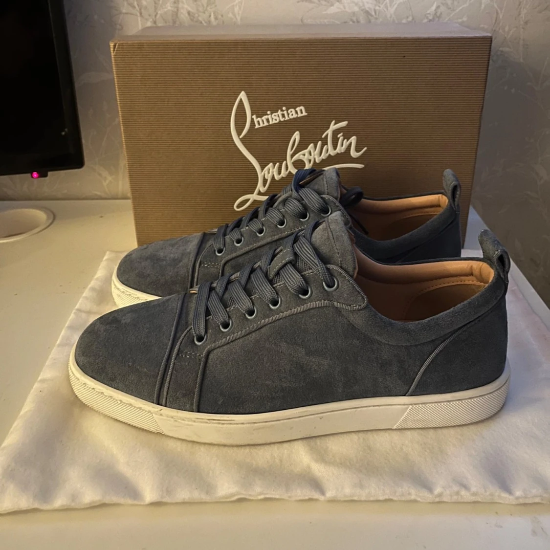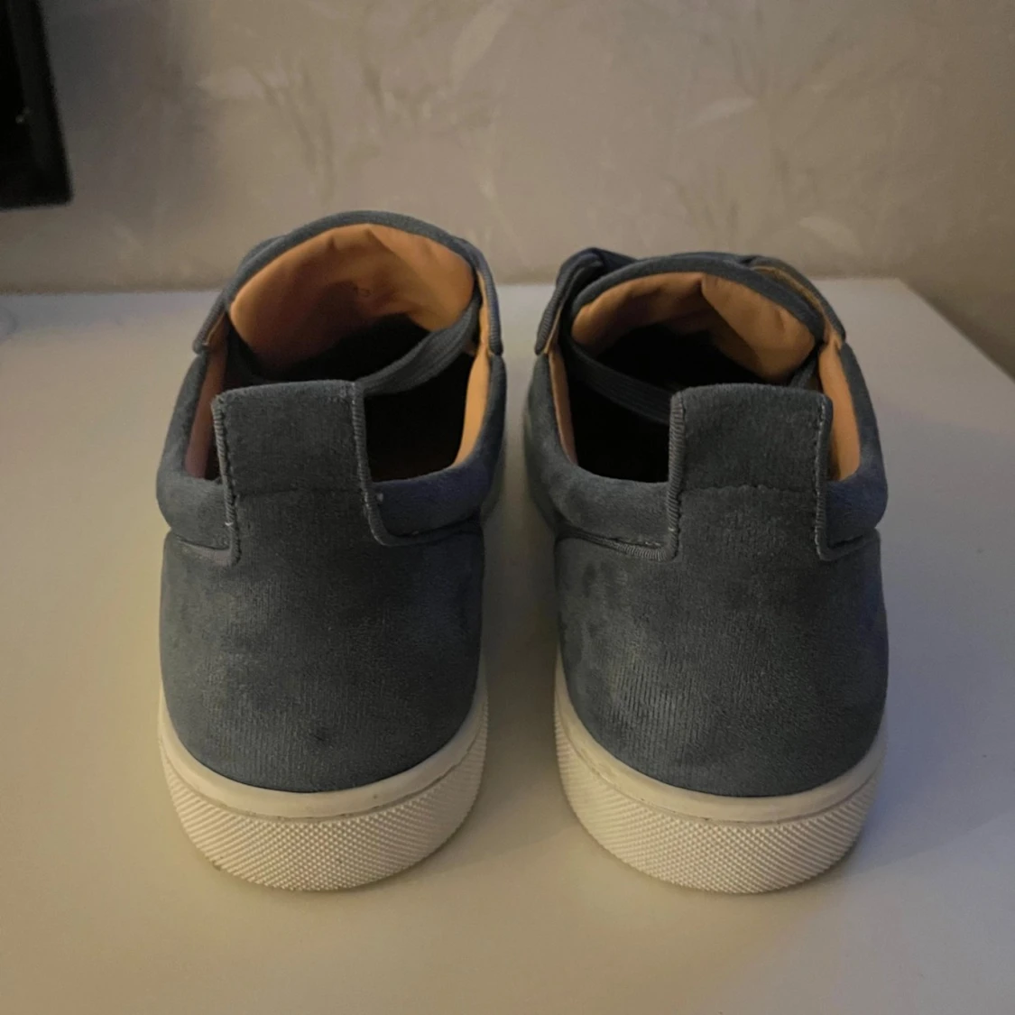 Säljer ett par snygga blå sneakers från Christian Louboutin i mocka. De har en klassisk design med snörning och en röd sula som ger en stilren look. Perfekta för både vardag och festliga tillfällen. Skorna är i mycket bra skick och kommer med originalkartong. Skorna är även äkta