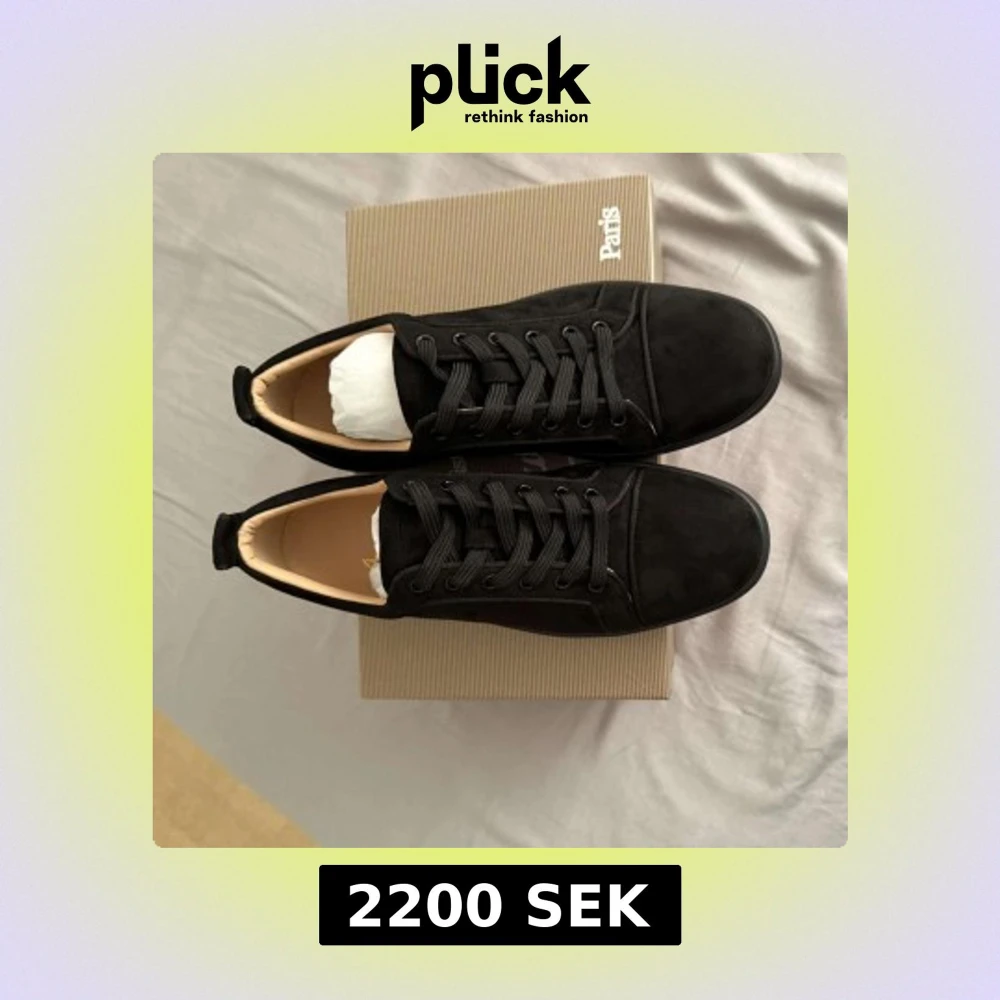 Säljer ett par svarta sneakers från Christian Louboutin med klassisk röd sula och diskret logga. Skorna har rund tå, platt sula och är tillverkade i mocka med svarta skosnören. Perfekta för dig som gillar stilrena och exklusiva sneakers.