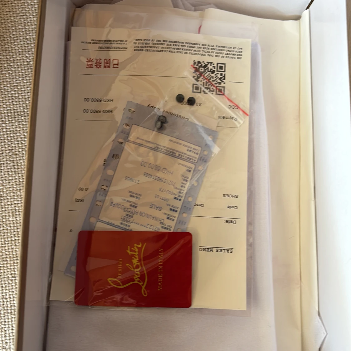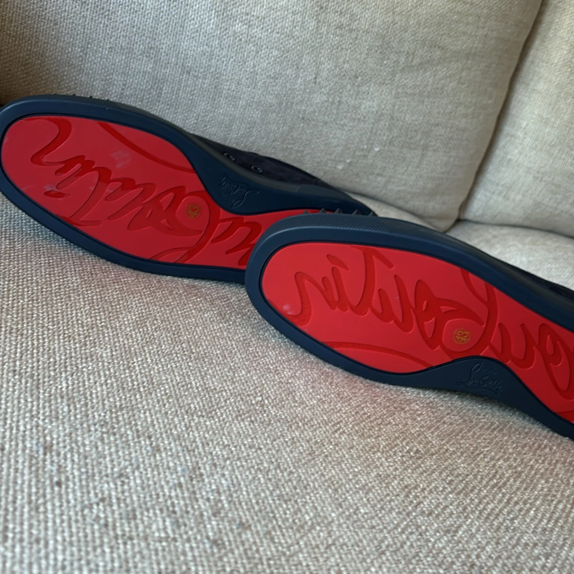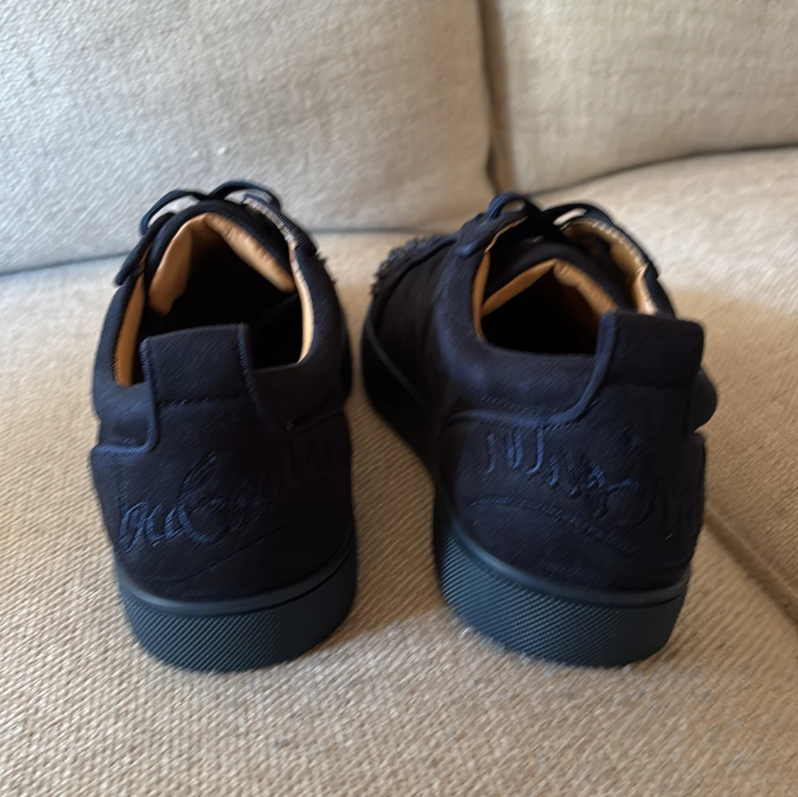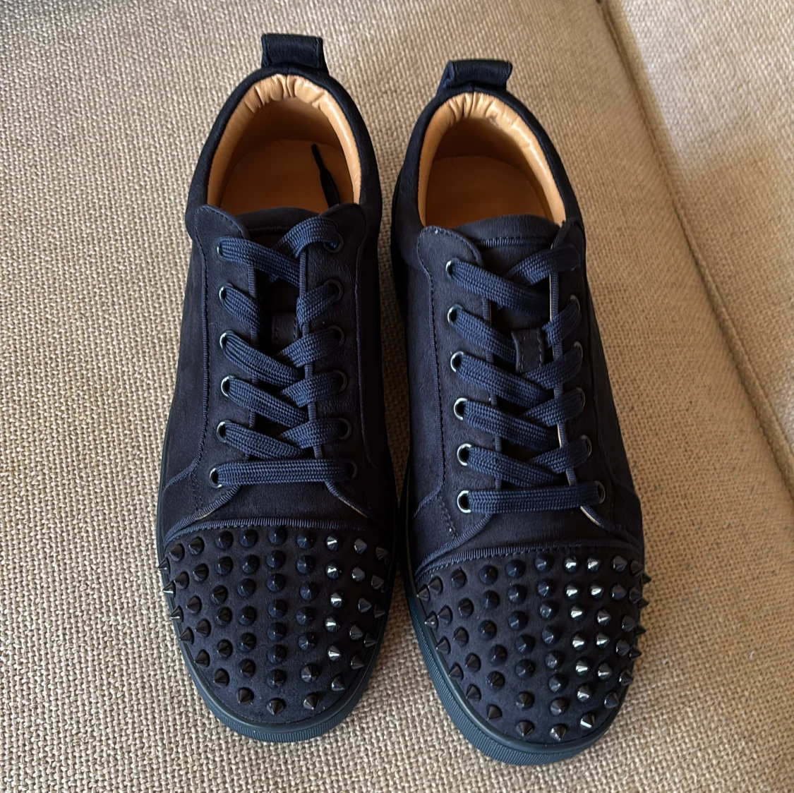 Säljer ett par mörkblåa sneakers i mocka från Christian Louboutin med coola nitar på tån och den ikoniska röda sulan. Skorna har snörning och rund tå, perfekt för dig som vill sticka ut med din stil.