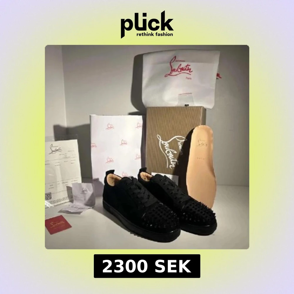 Svarta sneakers från Christian Louboutin med ikonisk röd sula och svarta nitar på tån. Skorna har snörning, rund tå och platt sula. Tillverkade i skinn och mocka med lyxig känsla och edgy vibe. Hör av dig om frågor ? Kan gå ner pris