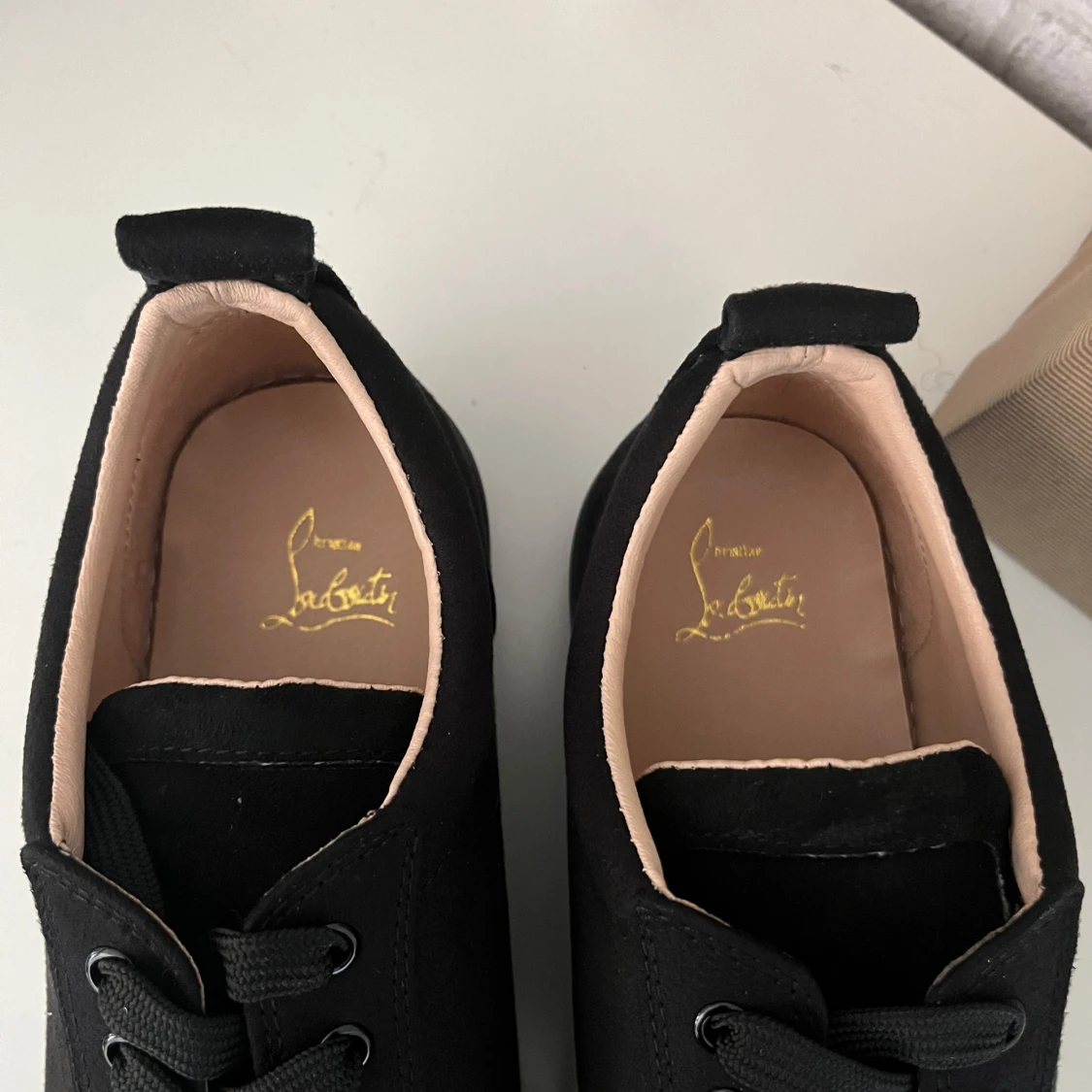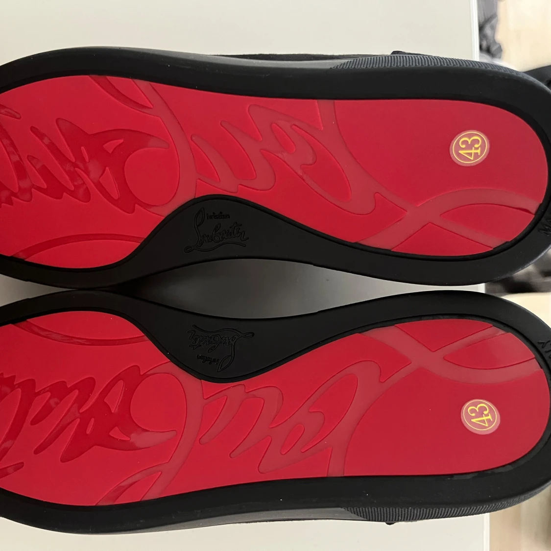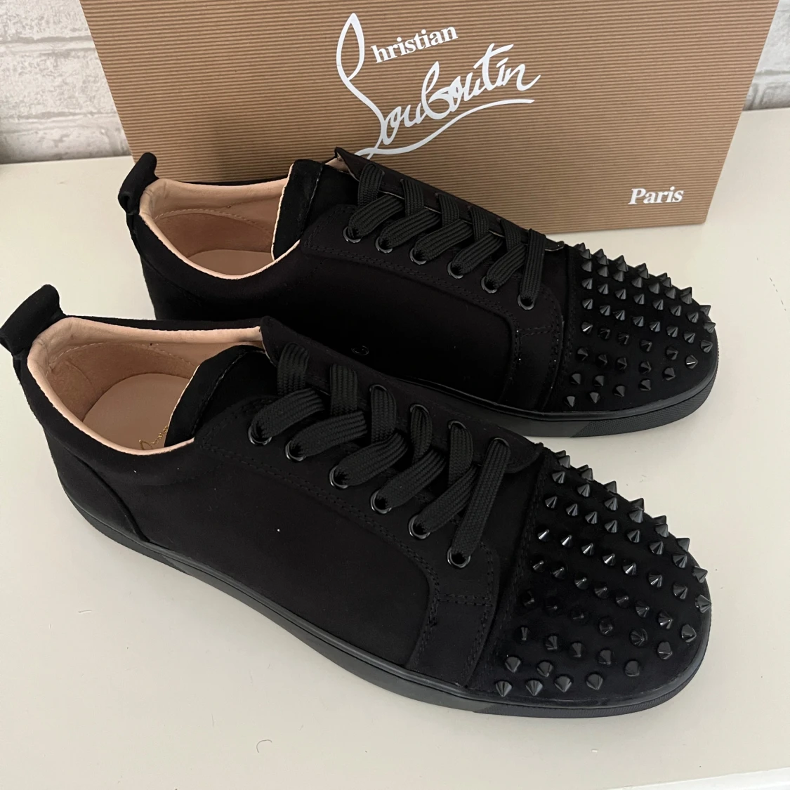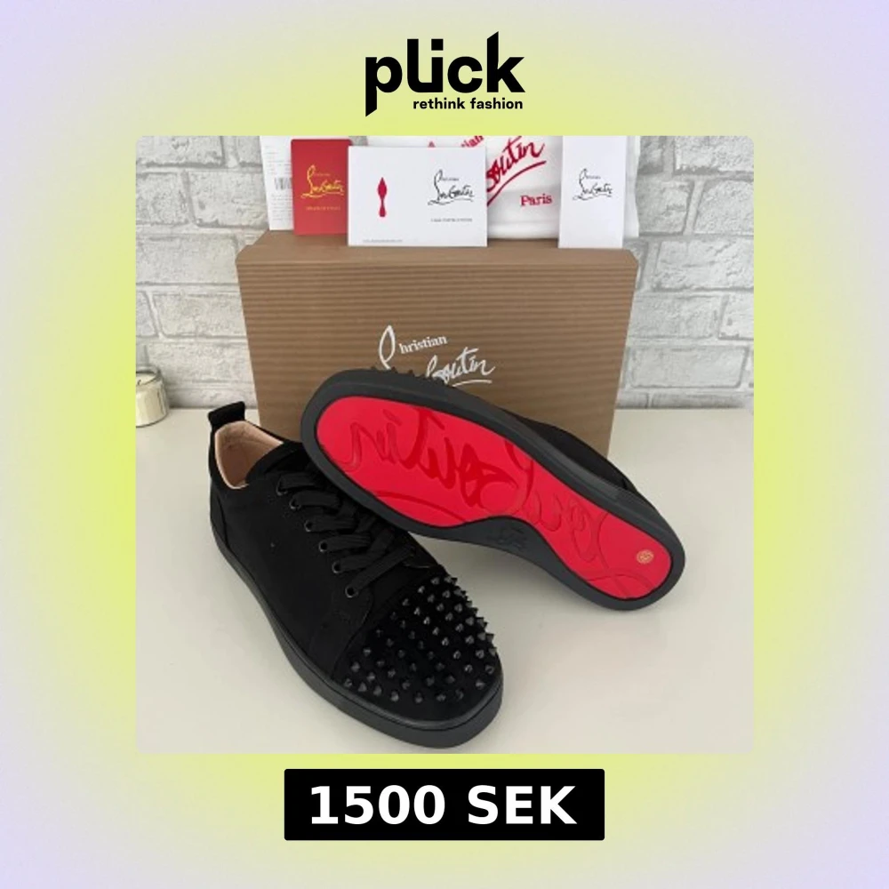 Säljer ett par svarta sneakers från Christian Louboutin med ikonisk röd sula och coola svarta nitar på tån. Skorna har snörning och är tillverkade i skinn med en platt sula. Perfekt för dig som vill sticka ut med en edgy och lyxig stil.