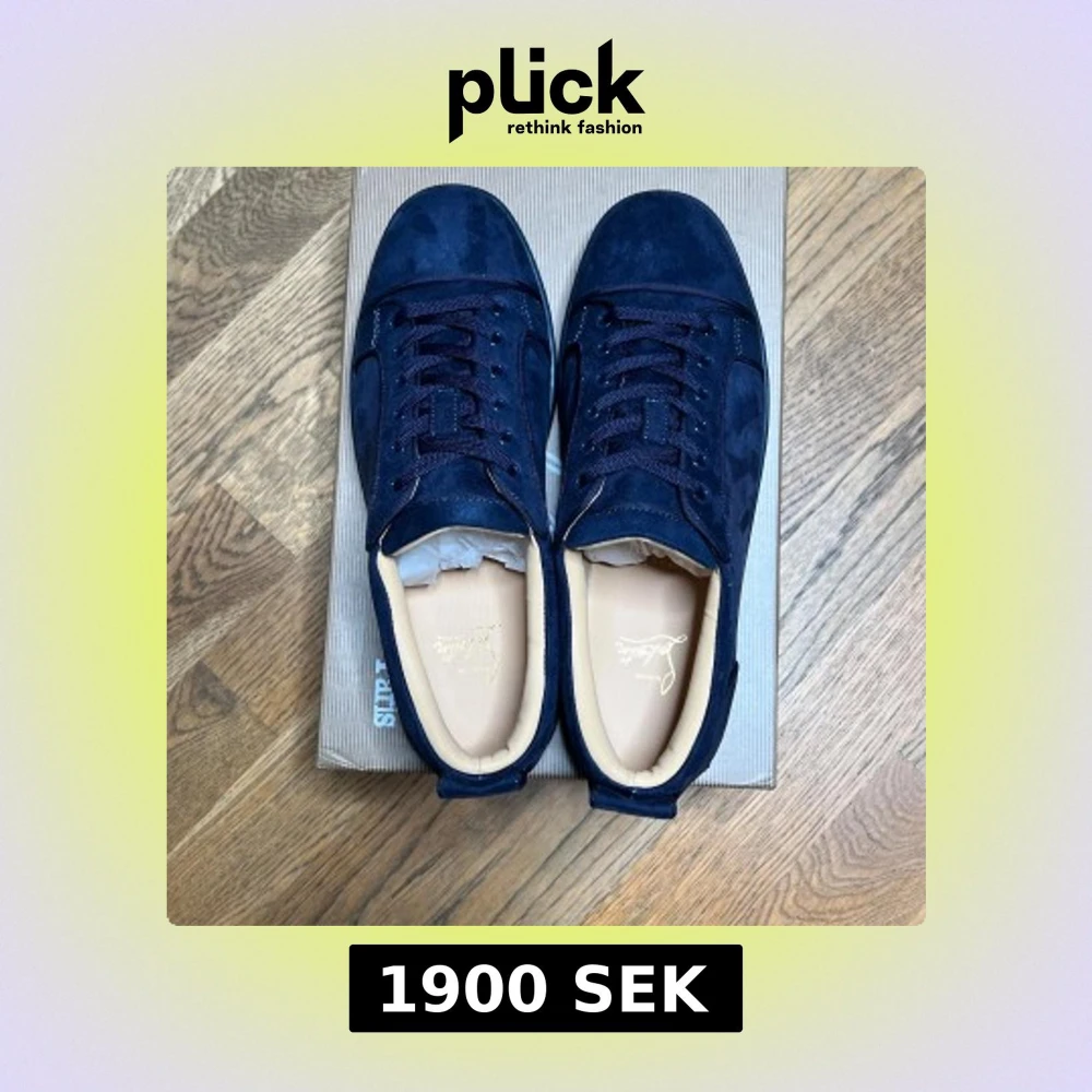 Snygga mörkblå sneakers i mocka från Christian Louboutin med klassisk röd sula och diskret logga på sidan. Skorna har rund tå, platt sula och snörning. Perfekta för dig som vill ha en lyxig och stilren look med en unik touch.