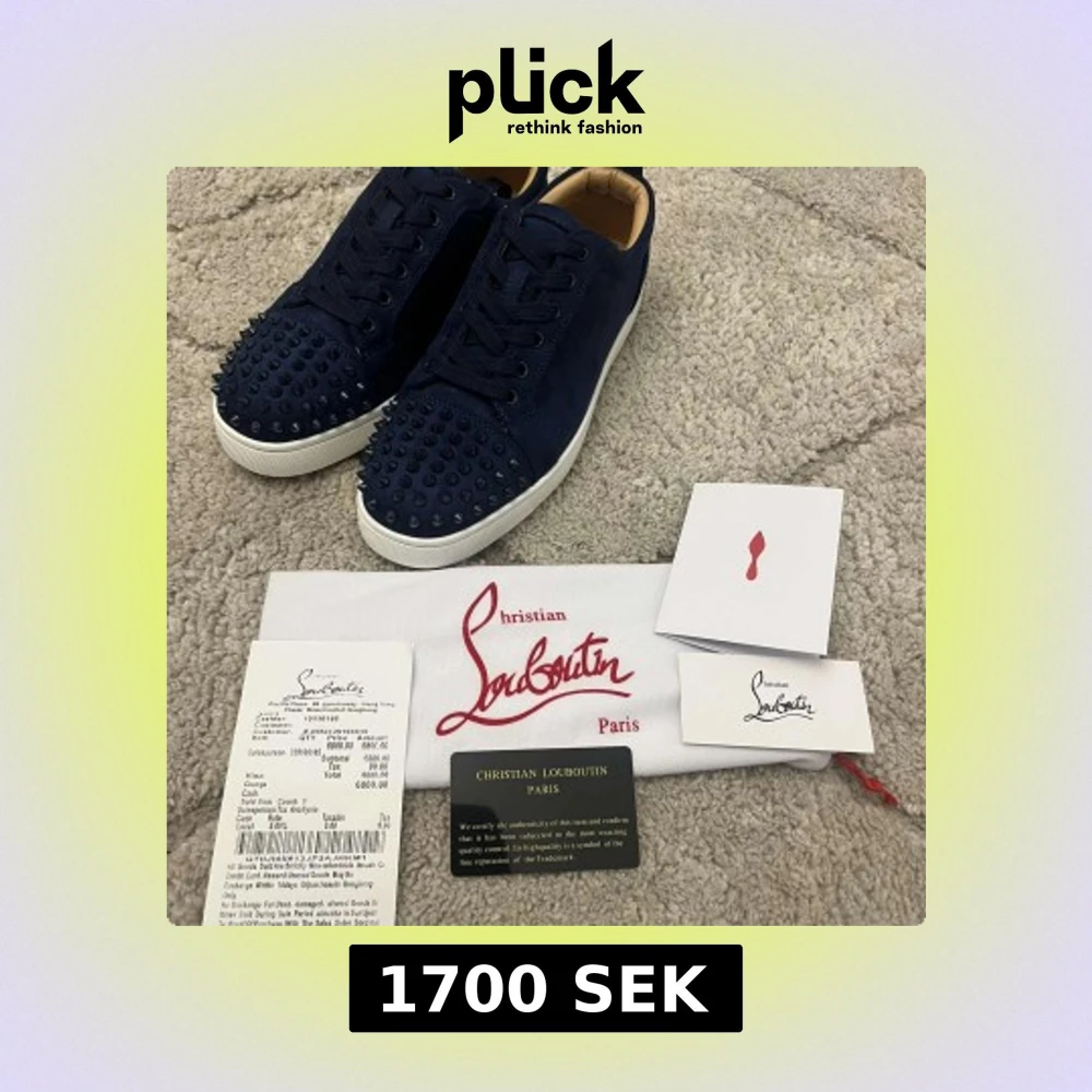 Mörkblå sneakers från Christian Louboutin med klassisk röd sula och coola nitar på tån. Skorna har snörning, rund tå och är tillverkade i mocka med läderdetaljer invändigt. Perfekta för dig som vill sticka ut med exklusiv stil.
