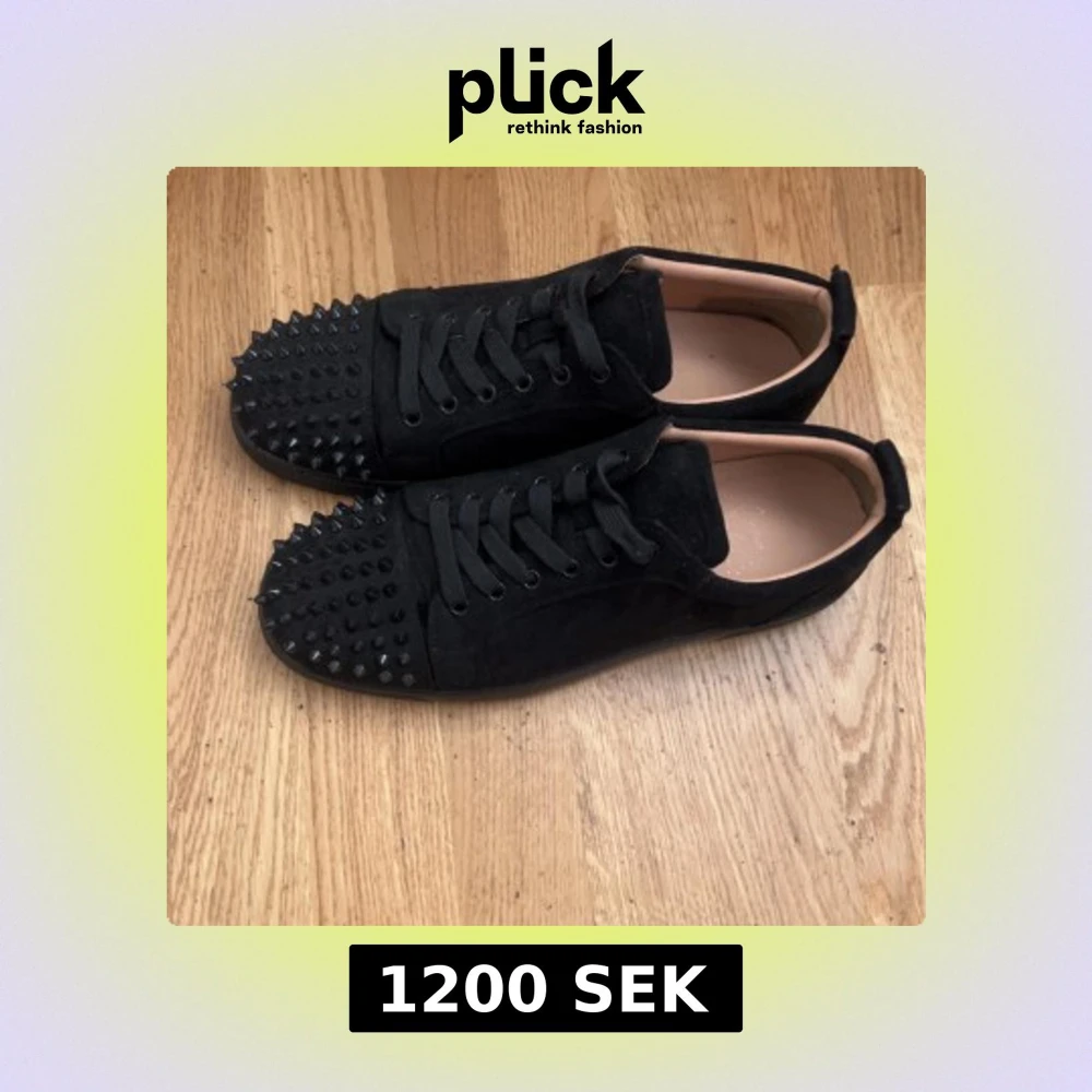 Svarta sneakers från Christian Louboutin i mocka med coola svarta nitar över tån och klassisk röd sula. Kommer med 3 extra nitar OBS saknar en nit.
