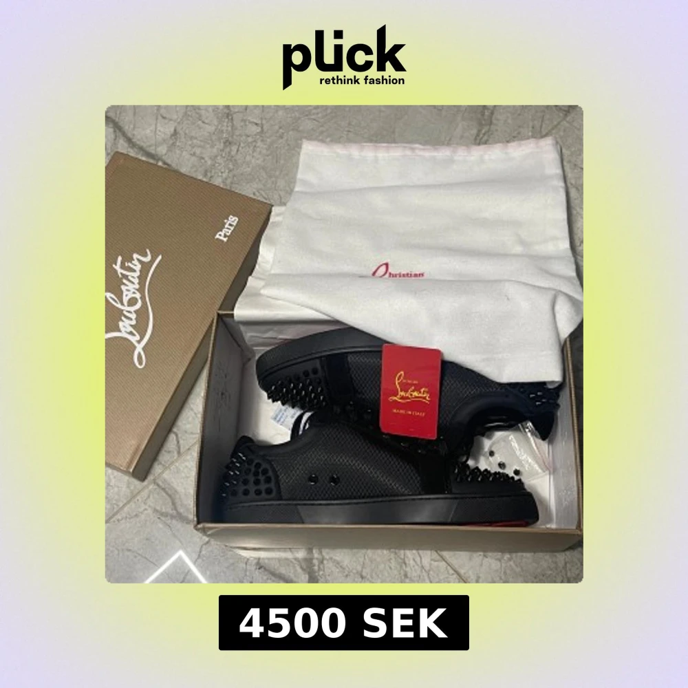 Snygga svarta sneakers från Christian Louboutin med ikonisk röd sula. Skorna är helt nya oanvända som jag fick i julklapp men gillade inte de. De är äkta och allt tillbehör följs med. (Storlek 43)