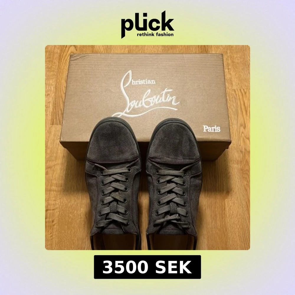 Snygga sneakers från Christian Louboutin i mörkgrå mocka med klassisk röd sula. Skorna är i storlek 43 men passar 42. Skorna har rund tå, grå snören och diskreta ventilationshål på sidan. Lite slitna på den röda sulan därför lite billigare. Passar till det mesta. Skick 8/10. Lämnar skorna så fort den som köper köper dem om inte jag är borta.
