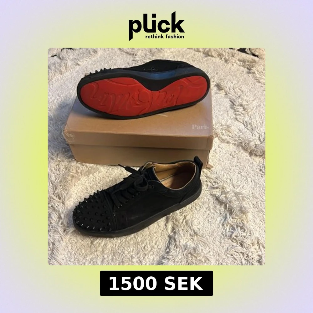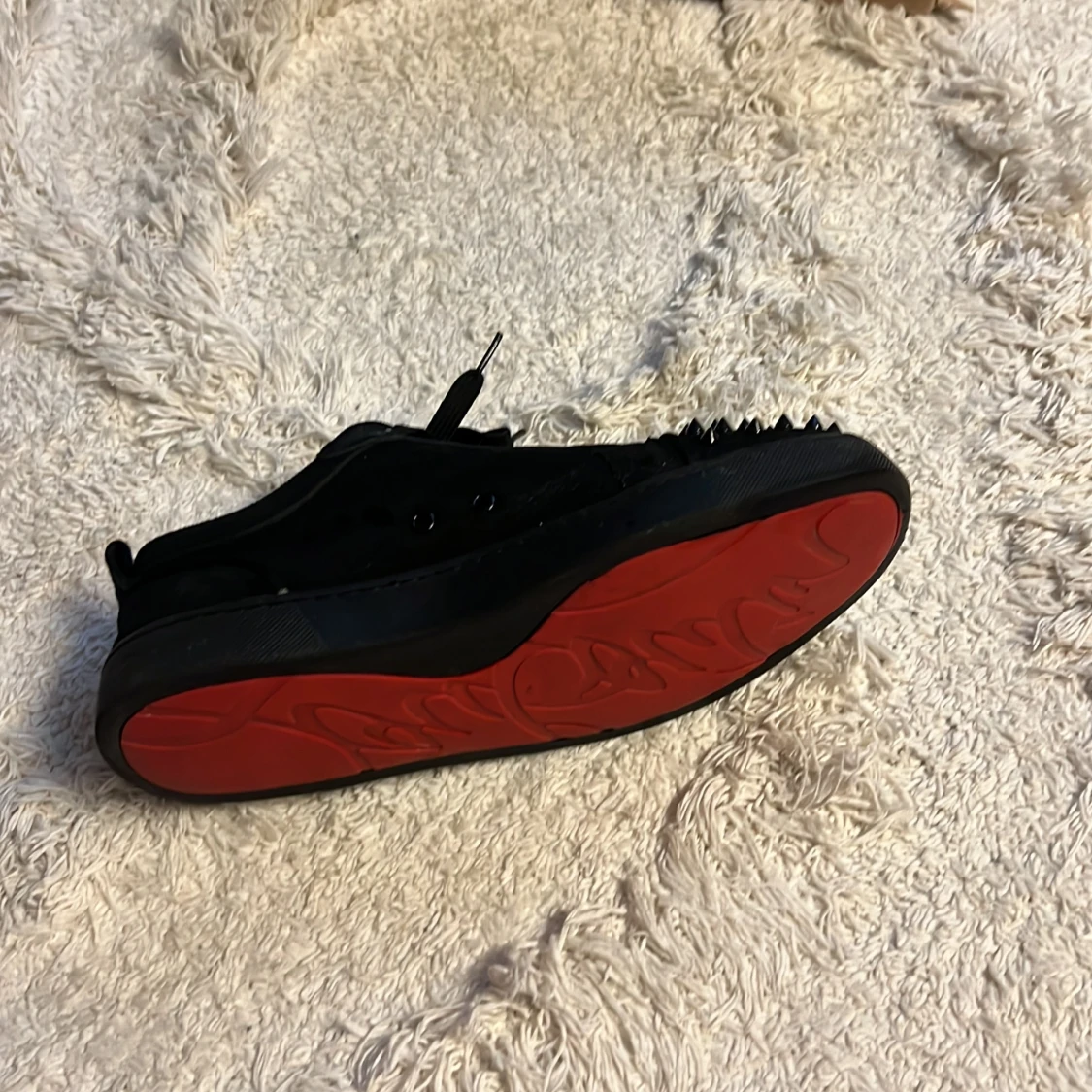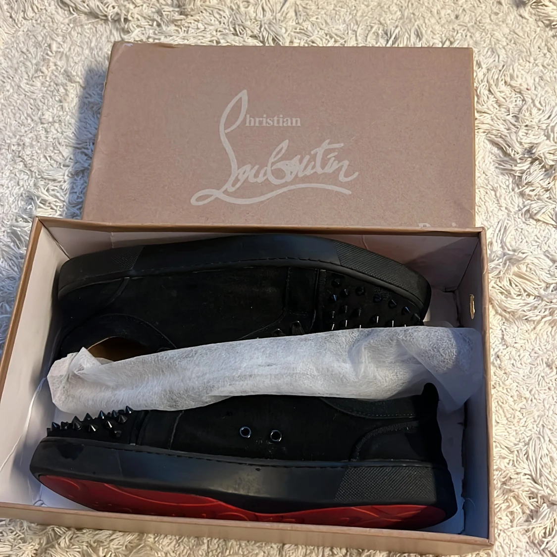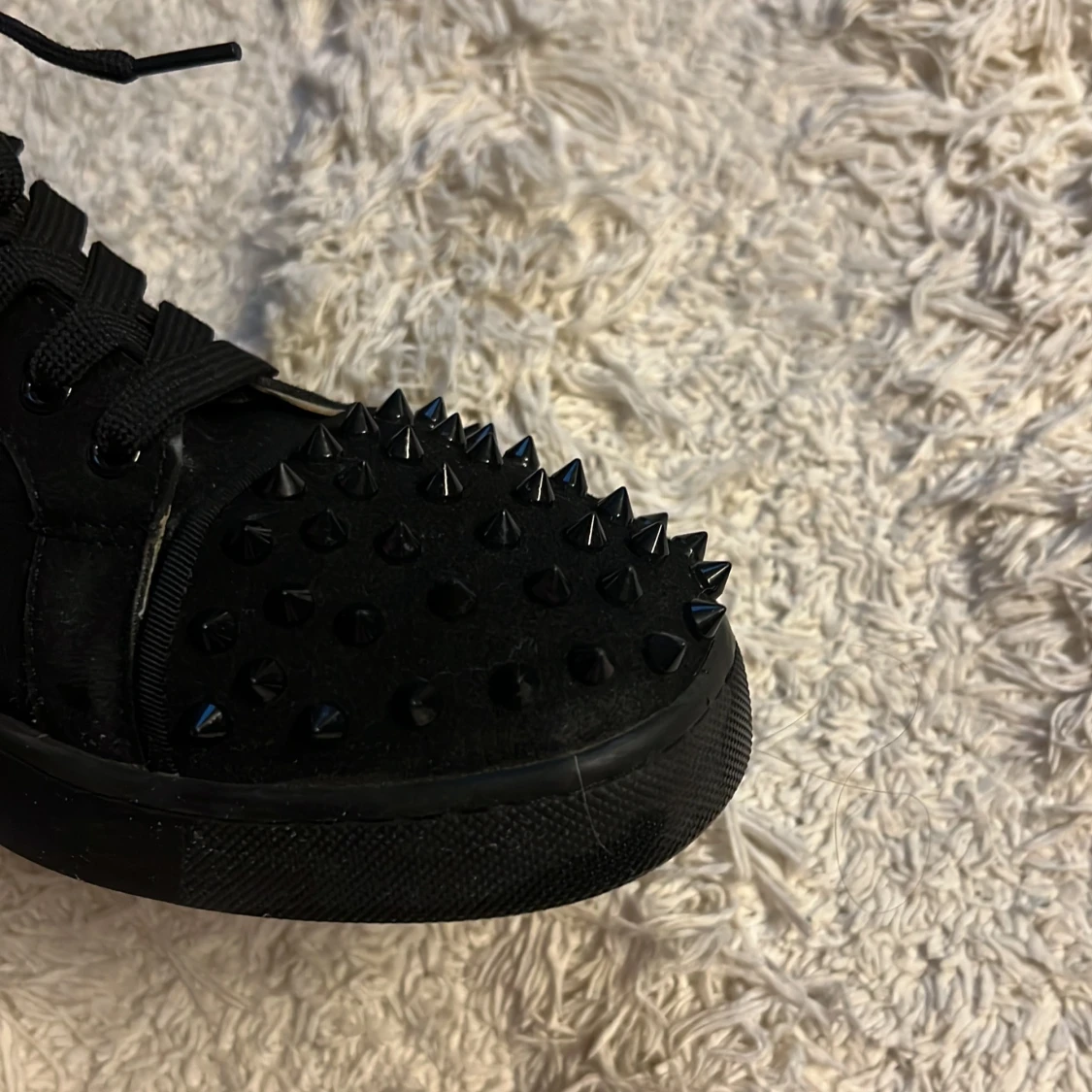 Svarta sneakers från Christian Louboutin med ikoniska röda sulor och svarta nitar på tån. Skorna har snörning och är tillverkade i mocka och skinn. Snygg och edgy design som sticker ut, perfekt för dig som gillar statement pieces.