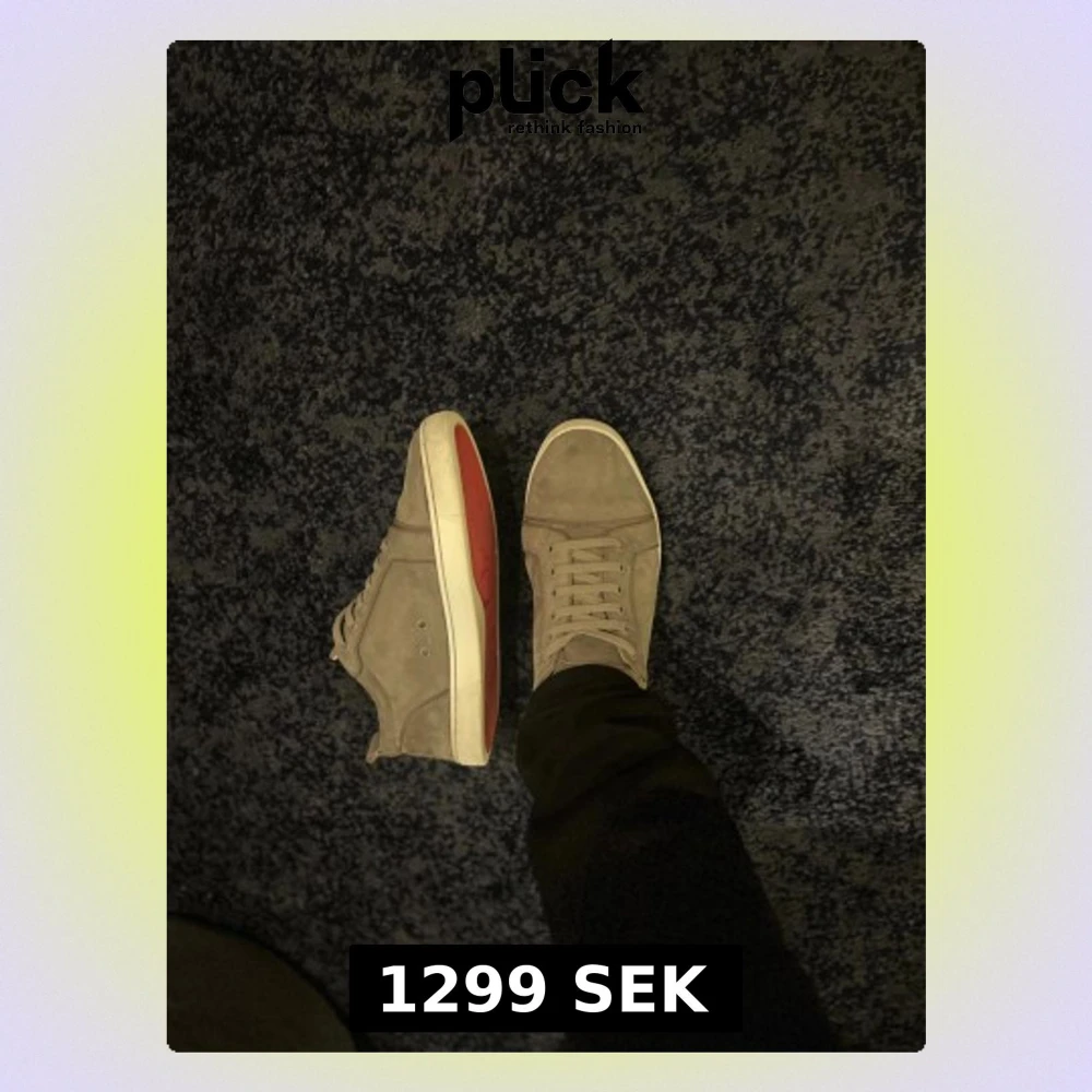 Säljer ett par grå sneakers från Christian Louboutin i mocka med klassisk röd sula. Skorna har snörning, rund tå och platt sula. Insidan är i beige skinn och de har en clean, stilren look som passar till det mesta.