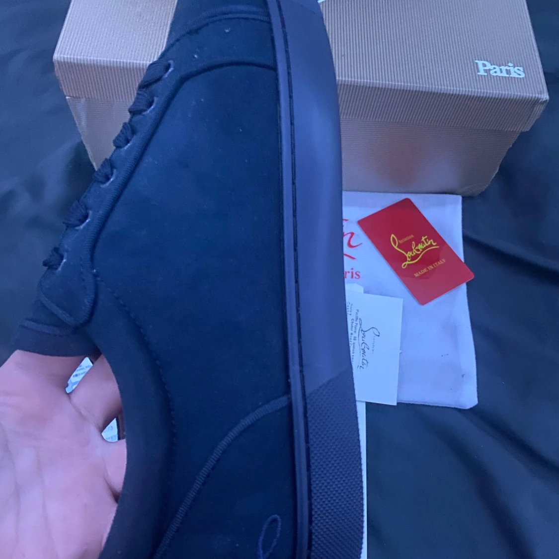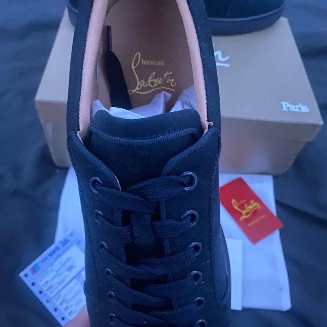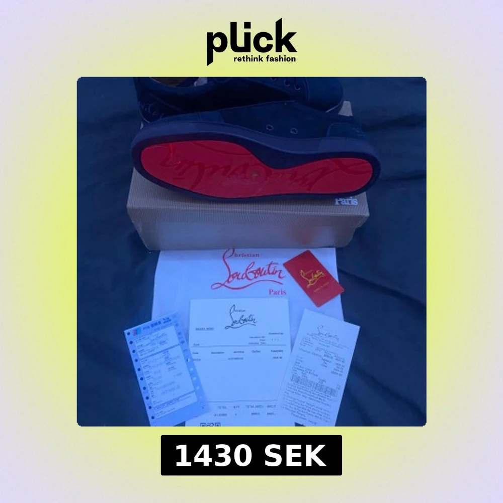 Snygga svarta sneakers från Christian Louboutin med klassisk röd sula och diskret logga på sidan. Skorna har snörning och är tillverkade i mocka med läderdetaljer. Perfekta för dig som vill ha en lyxig och stilren look med en ikonisk touch. Box hörn är av har fixat den dock och 1100kr prutat å klart