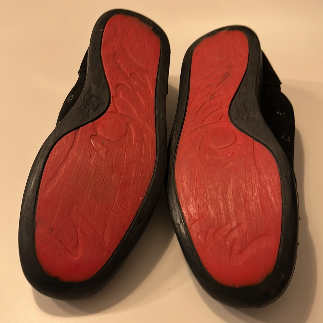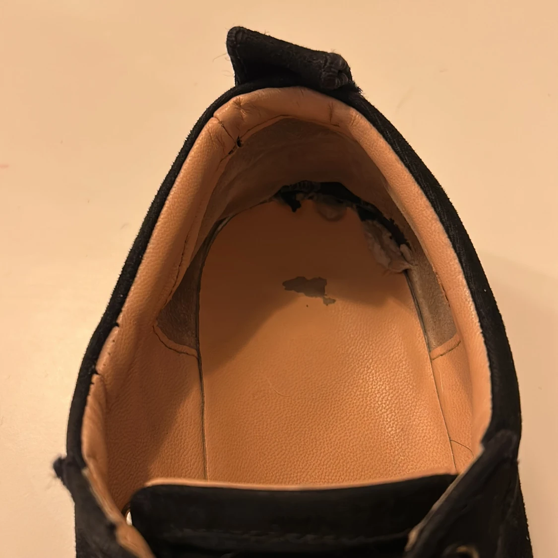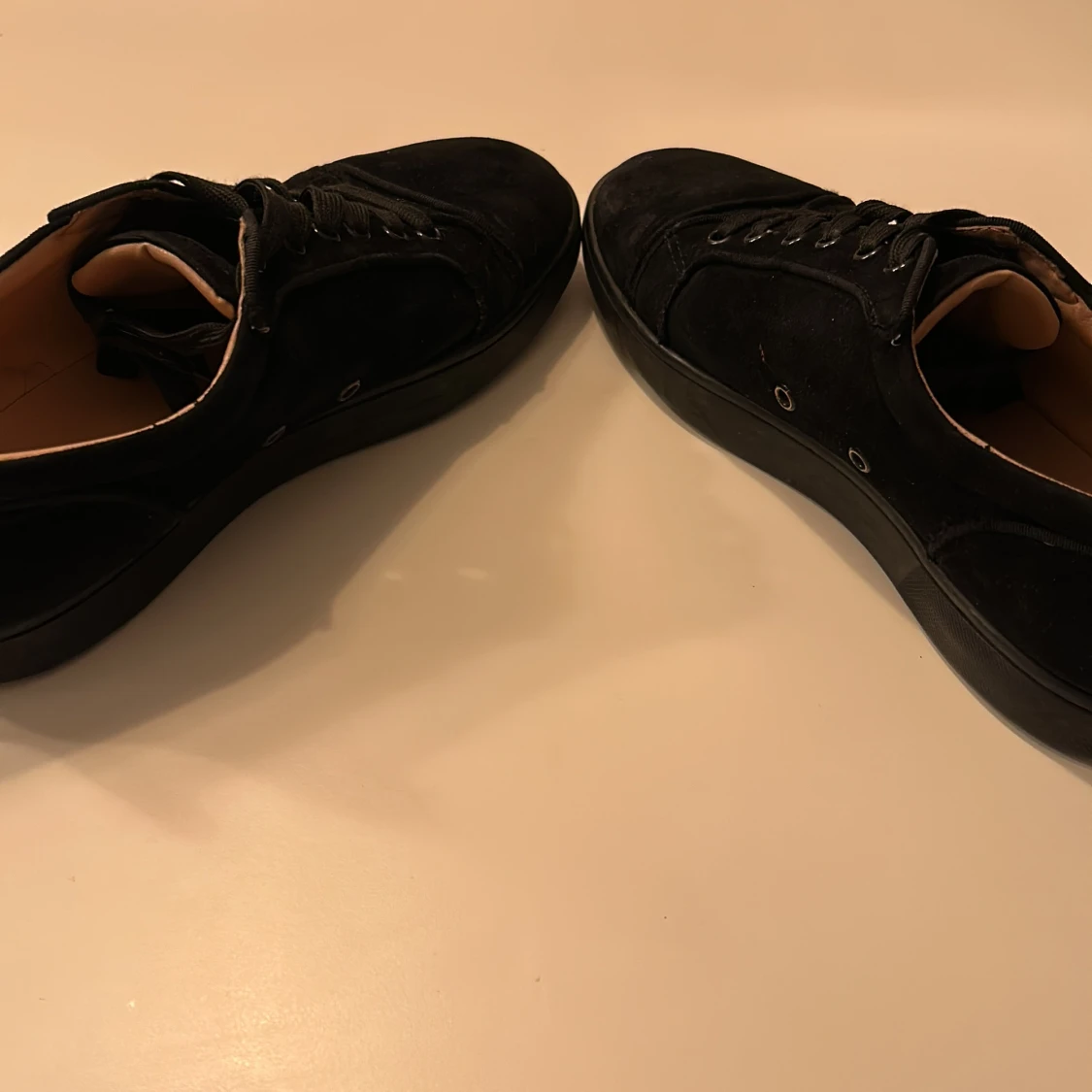 Snygga svarta sneakers i mocka med en iögonfallande röd sula. Skorna har klassisk snörning och en bekväm innersula i beige. Perfekta för en stilren look. Ända problemet är att det har gått sönder lite av sulan på vänster sko.