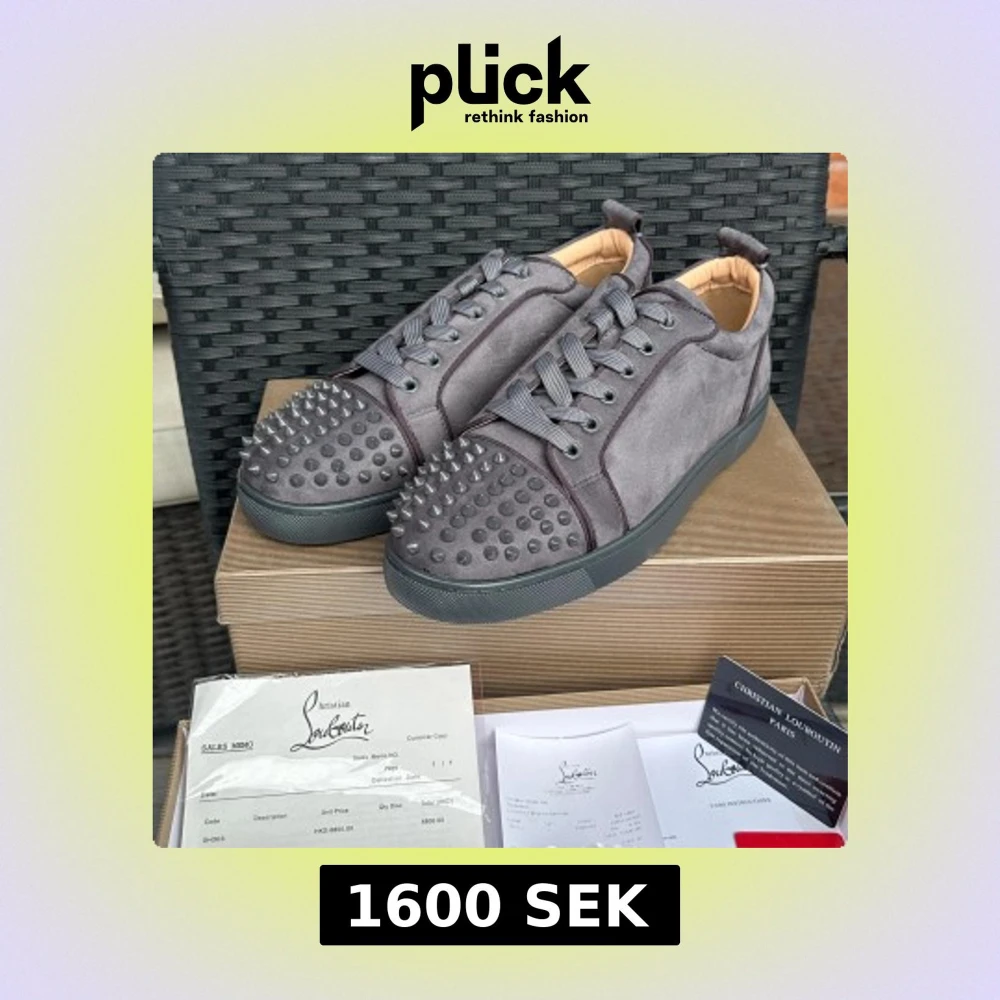 Säljer ett par gråa sneakers från Christian Louboutin i mocka med coola nitar framtill och klassisk röd sula. Skorna har snörning och rund tå, perfekt för dig som vill sticka ut med din stil. Använda 1 gång, skicket är som nya, kvitto och box och extra nitar mm medföljer, pris kan diskuteras. Har storlek 42,43,44 så bara skriva vilka ni vill ha.