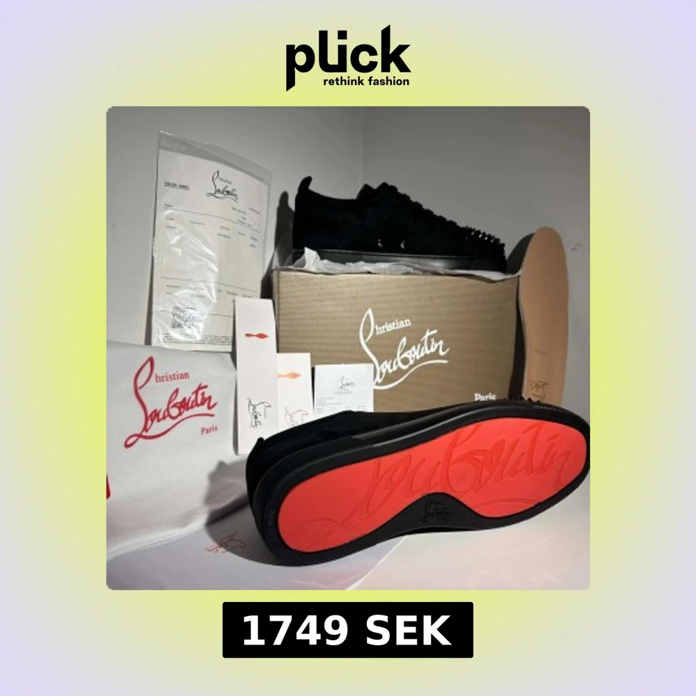 Snygga svarta sneakers från Christian Louboutin med ikoniska röda sulor. Skorna har en cool design med nitar på ovansidan och är tillverkade i mocka. Perfekta för att ge din outfit en edgy touch.