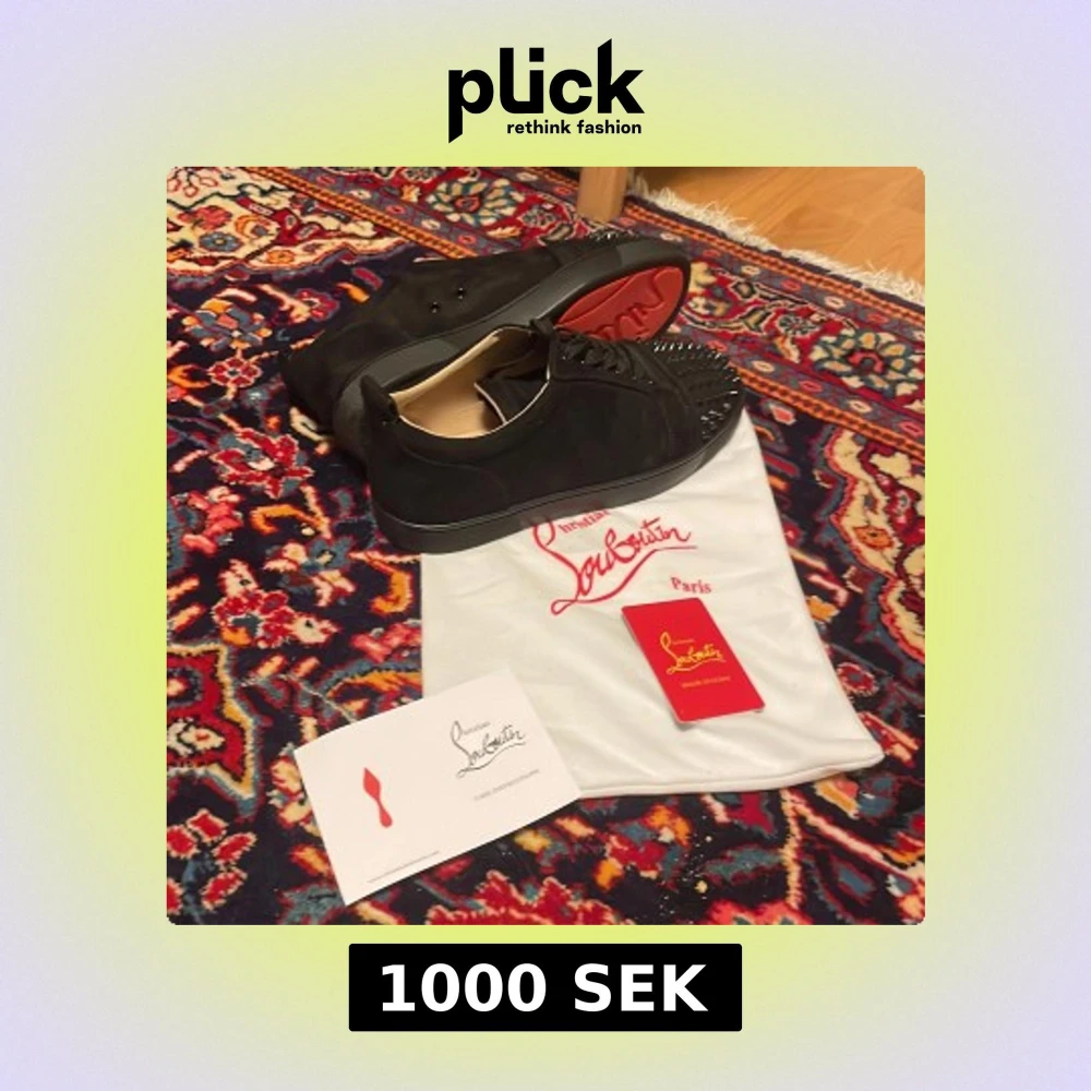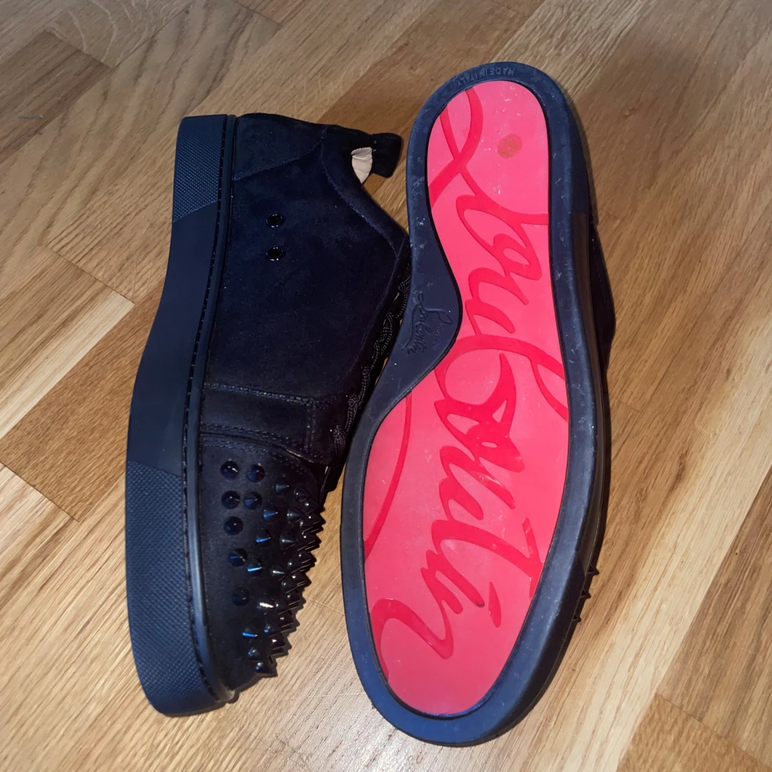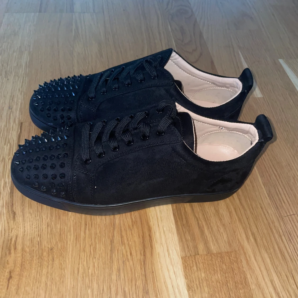 Svarta sneakers från Christian Louboutin i mocka med svarta nitar på tån och klassisk röd sula. Skorna har snörning och rund tå, samt exklusiv känsla med läderdetaljer invändigt. Perfekta för dig som vill sticka ut med en edgy och lyxig stil.
