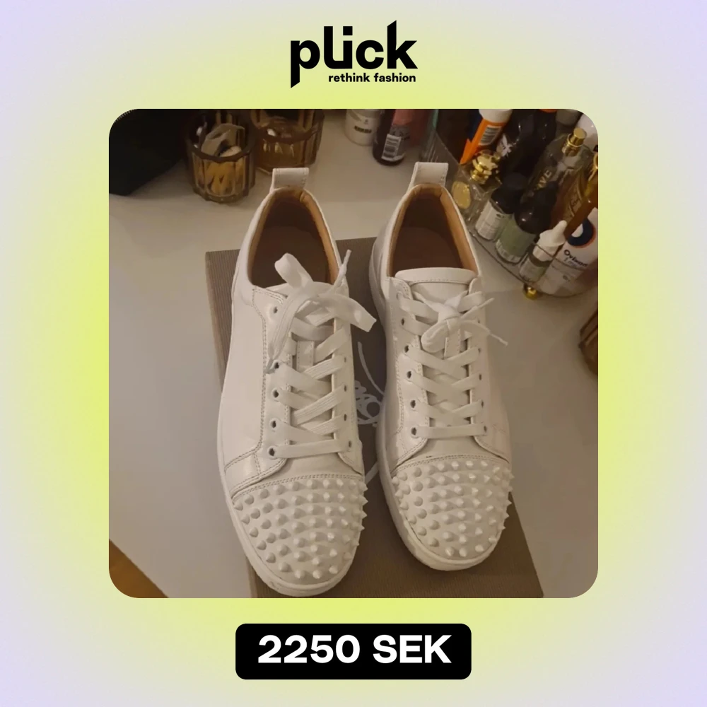 Säljer ett par vita sneakers från Christian Louboutin i skinn med coola nitar på tån. De har snörning och är i nytt skick aldrig använda. Perfekta för att ge din outfit en edgy touch! Kommer med originalförpackning och dustbag.