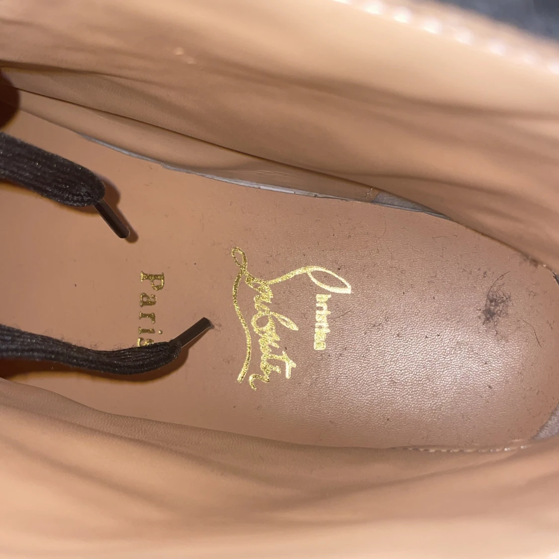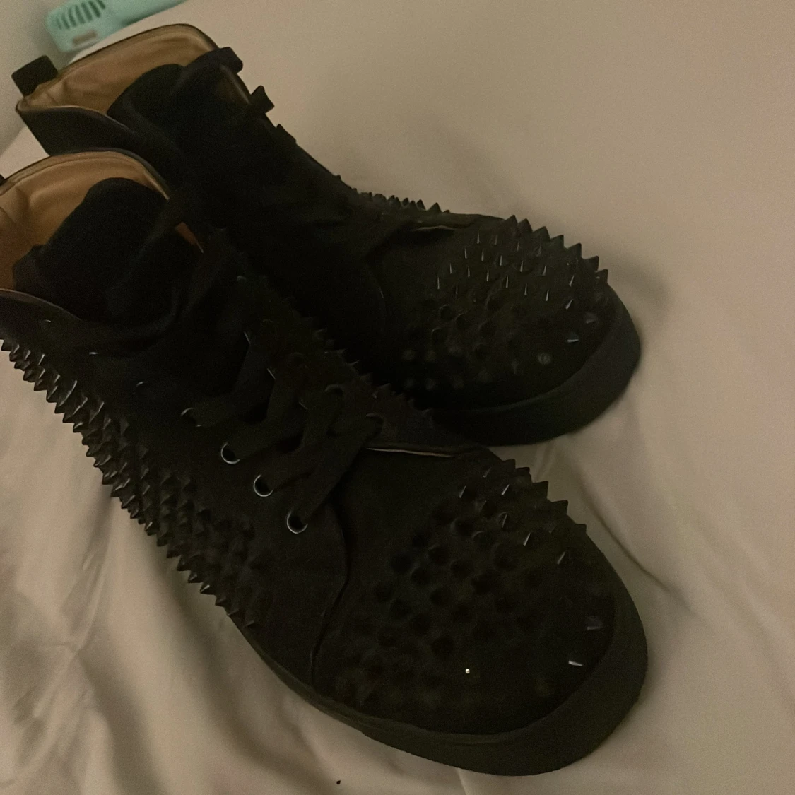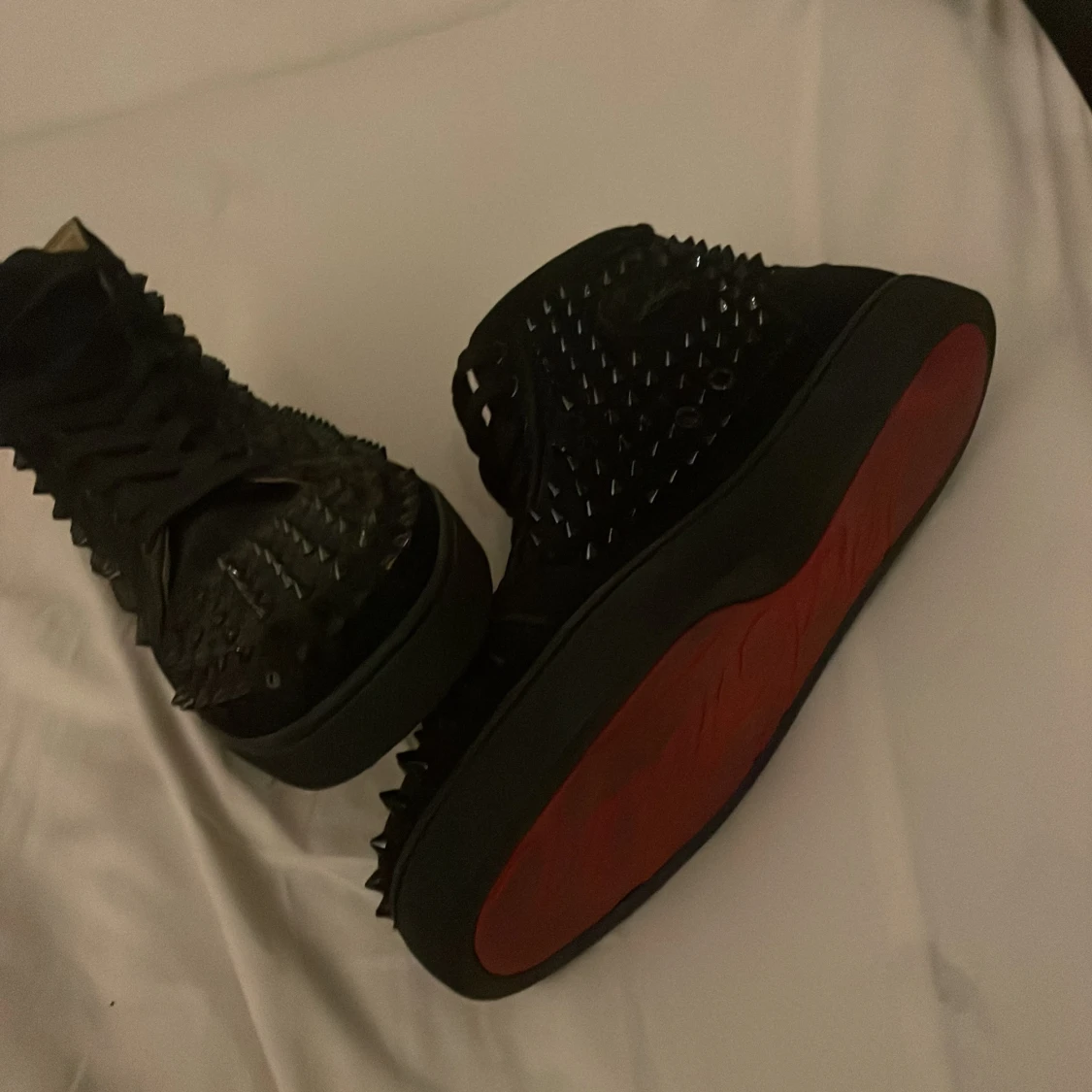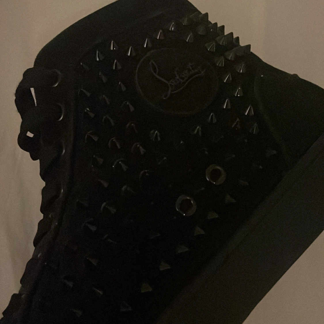 Grymma svarta sneakers från Louboutin med mattsvarta nitar över hela skon och den ikoniska röda sulan. Skorna har snörning och är tillverkade i mocka och skinn, vilket ger en lyxig känsla. Perfekta för dig som vill sticka ut med en edgy vibe. Dom e äkta fick dom av min storebror har tuvärr kvitto och box