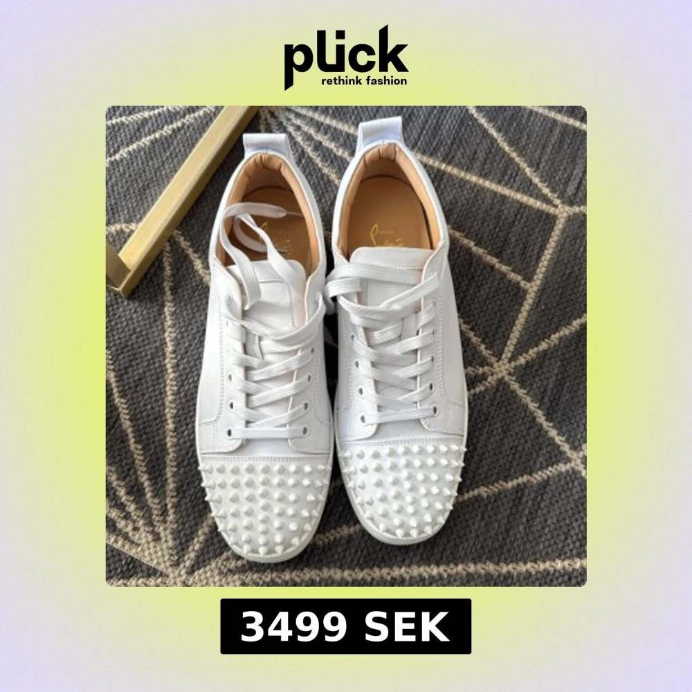 Säljer ett par vita sneakers från Christian Louboutin med ikonisk röd sula och coola vita nitar på tån. Skorna har snörning och är tillverkade i skinn. Perfekta för dig som vill sticka ut med en lyxig och edgy stil.