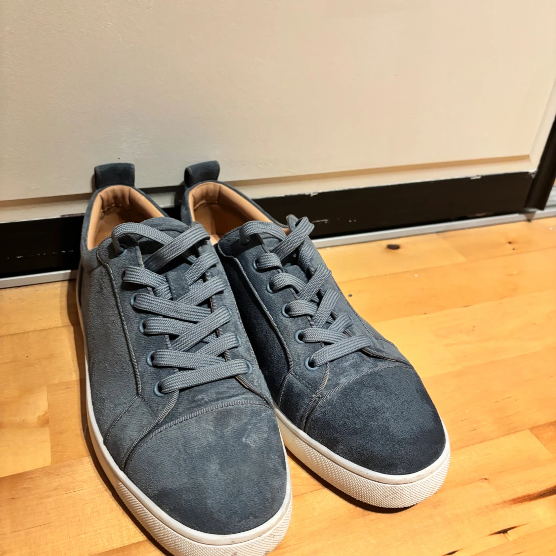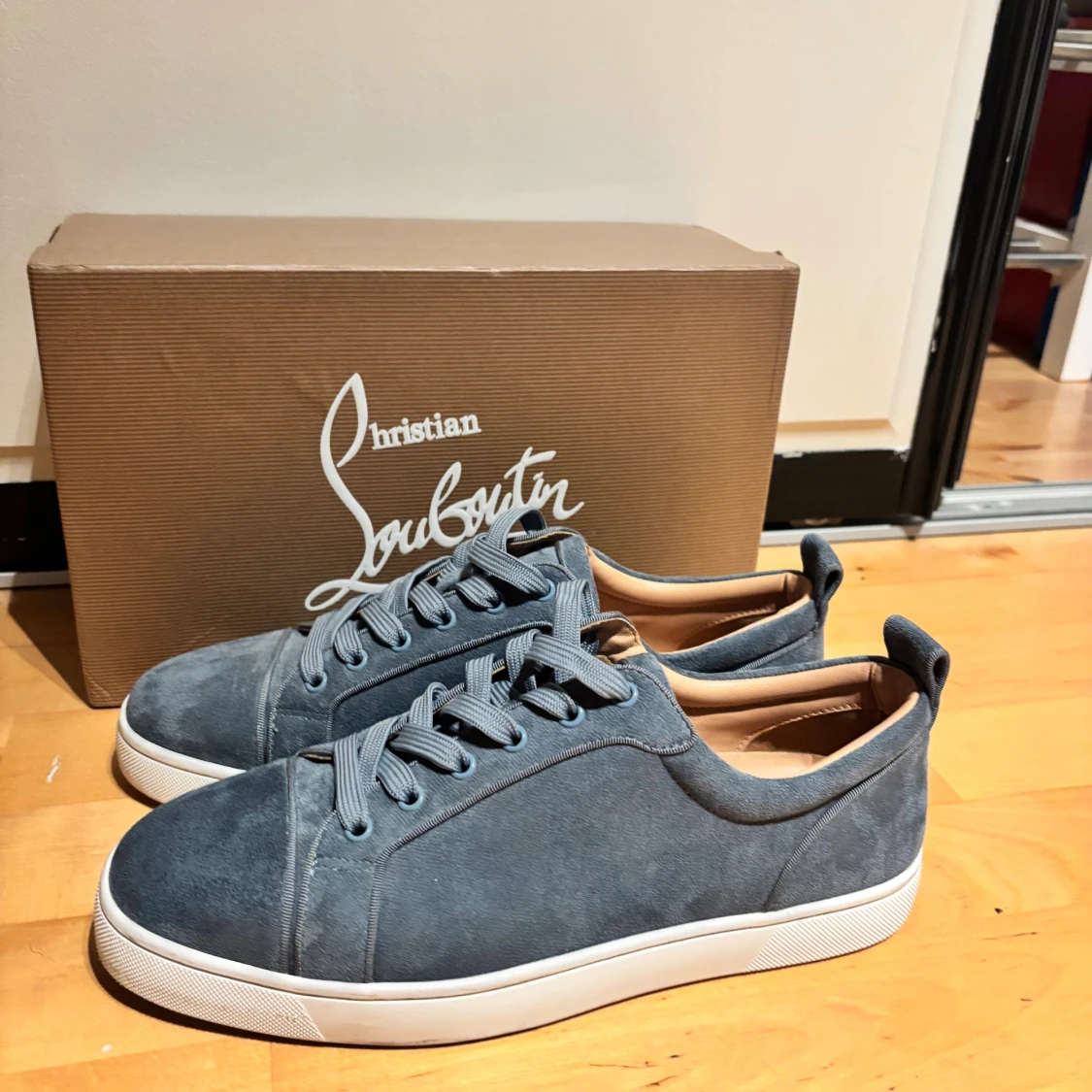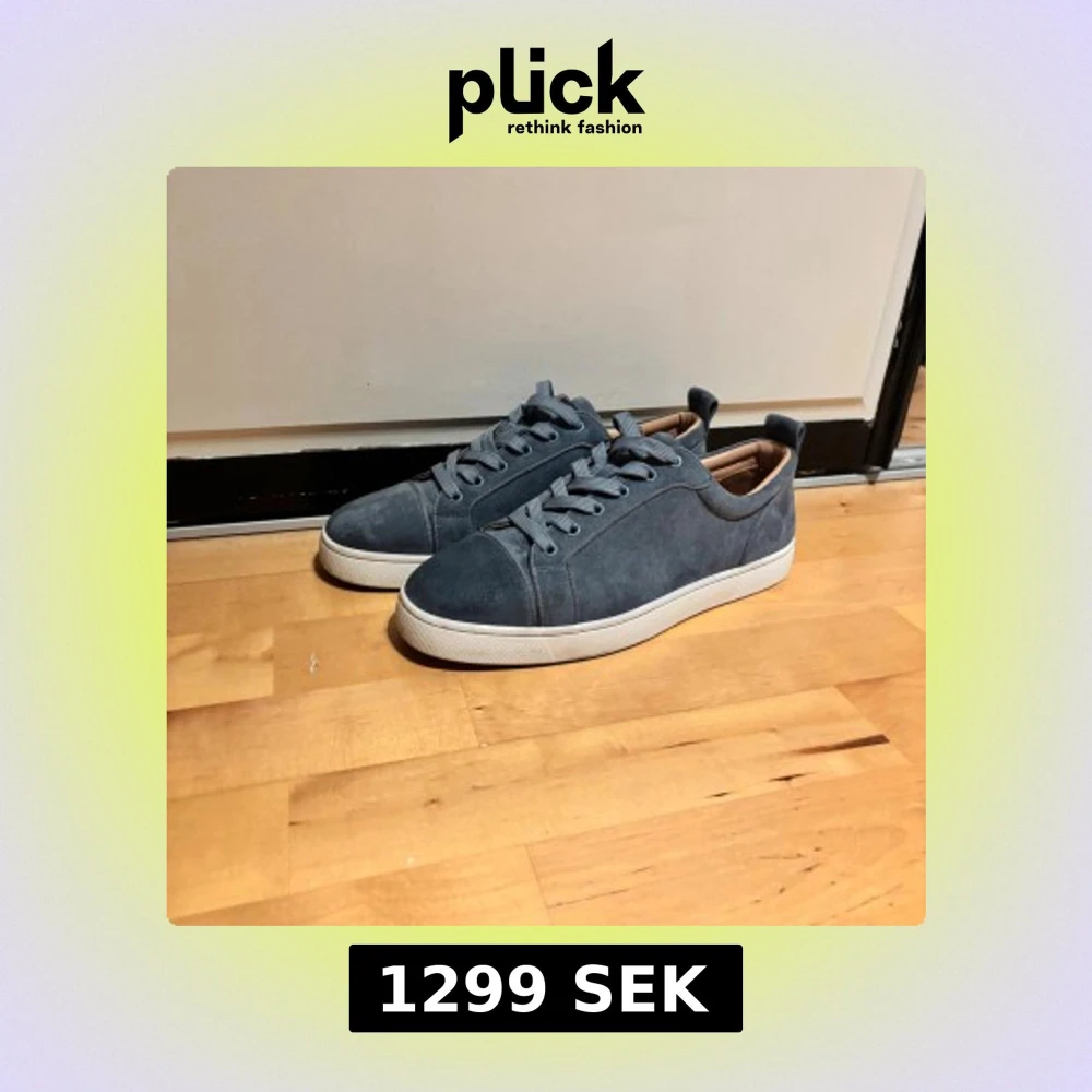 Snygga blå sneakers i mocka från Christian Louboutin med klassisk vit sula och den ikoniska röda undersidan. Skorna har rund tå, snörning och diskreta detaljer. Insidan är beige och de har en stilren, minimalistisk look som passar till många outfits. Säljes pga att dem är för små kan inte garantera äkthet då dem är köpta här på plick därför de säljes billigt. Box och dustbag medföljer