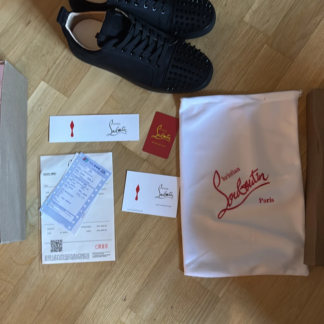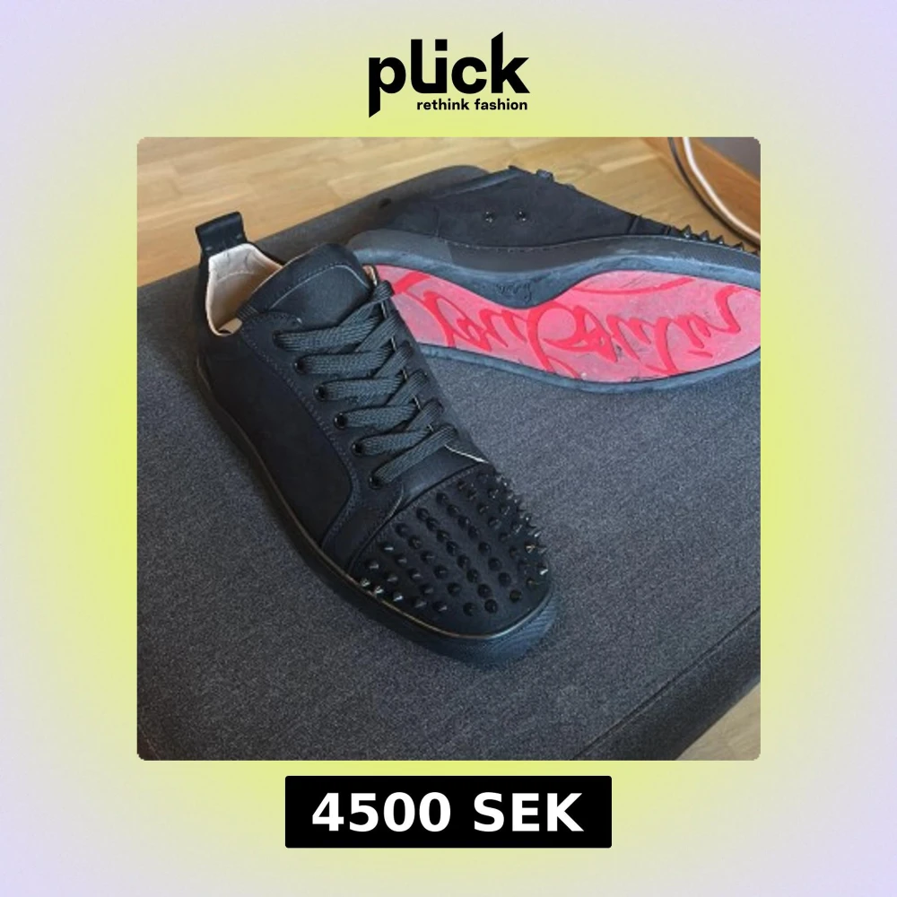 Säljer ett par svarta sneakers från Christian Louboutin med ikonisk röd sula och coola svarta nitar på tån. Skorna har snörning och är tillverkade i skinn och mocka. Perfekta för dig som vill sticka ut med en lyxig och edgy stil.