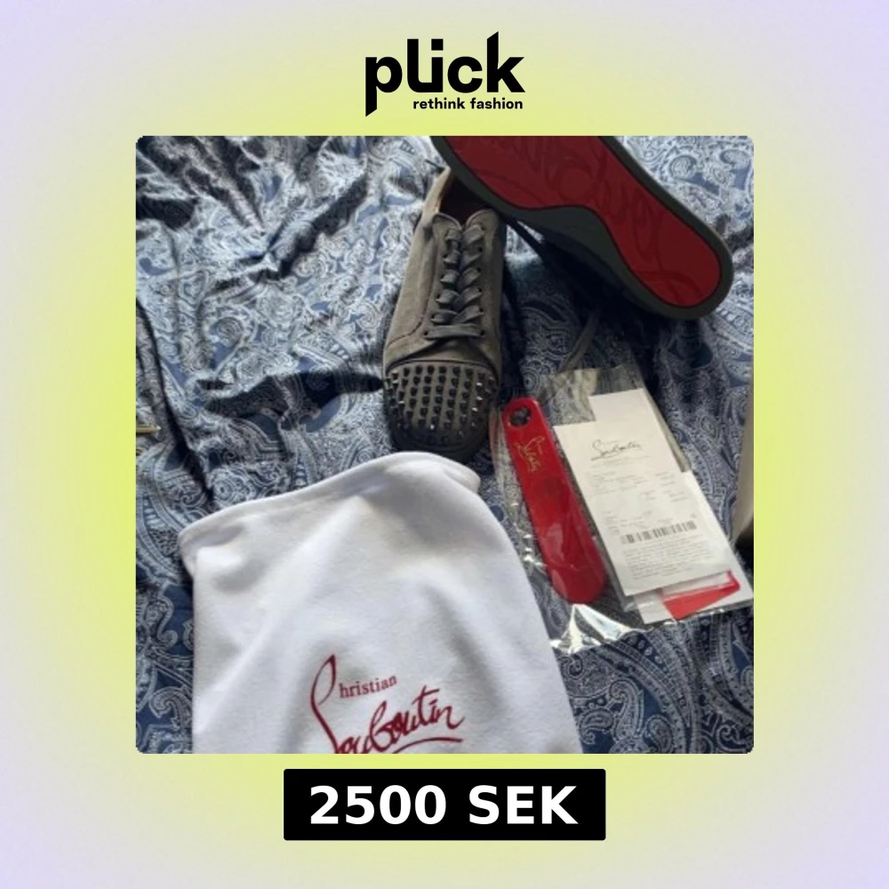 Säljer ett par gråa sneakers från Christian Louboutin med gråa nitar på tån och den klassiska röda sulan. Skorna har snörning och är tillverkade i mocka. Kommer med dustbag och skohorn. Kvitto följer med