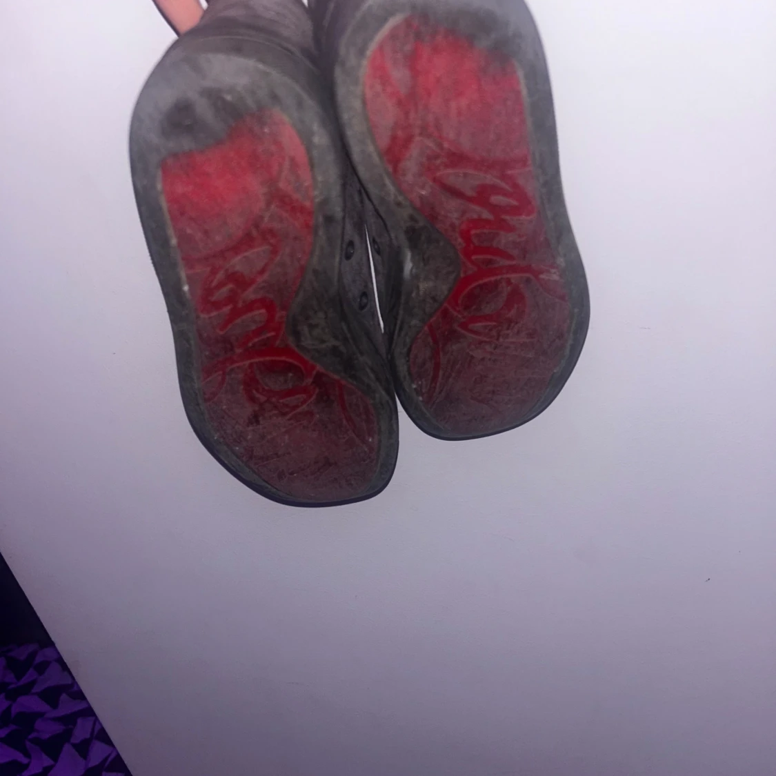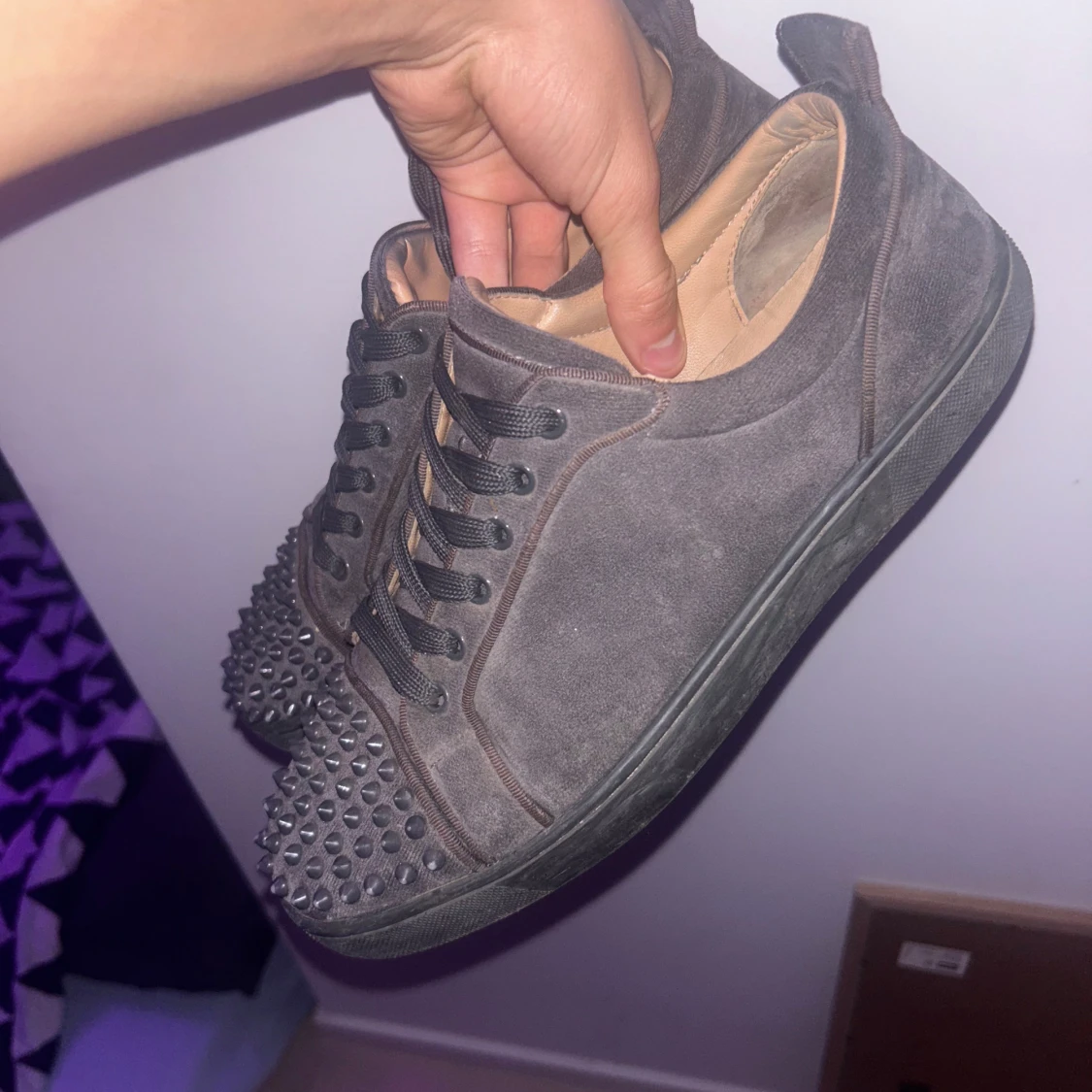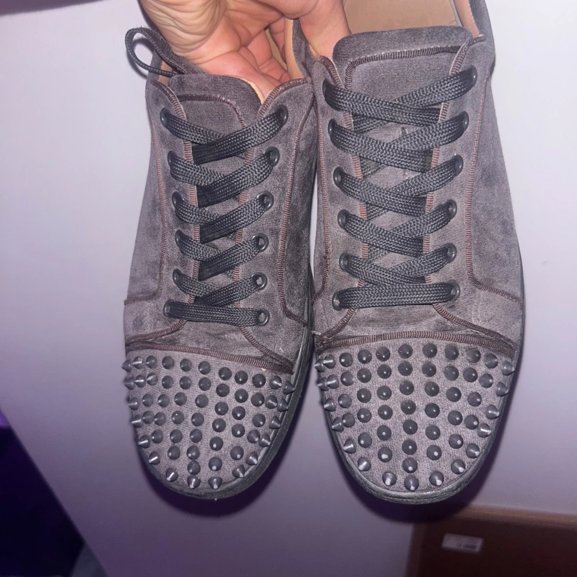 Säljer ett par gråa sneakers i mocka från Christian Louboutin med gråa nitar på tån och klassisk röd sula. Skorna har gråa snören och en rund tå. Perfekta för dig som vill sticka ut med en edgy vibe. Box finns