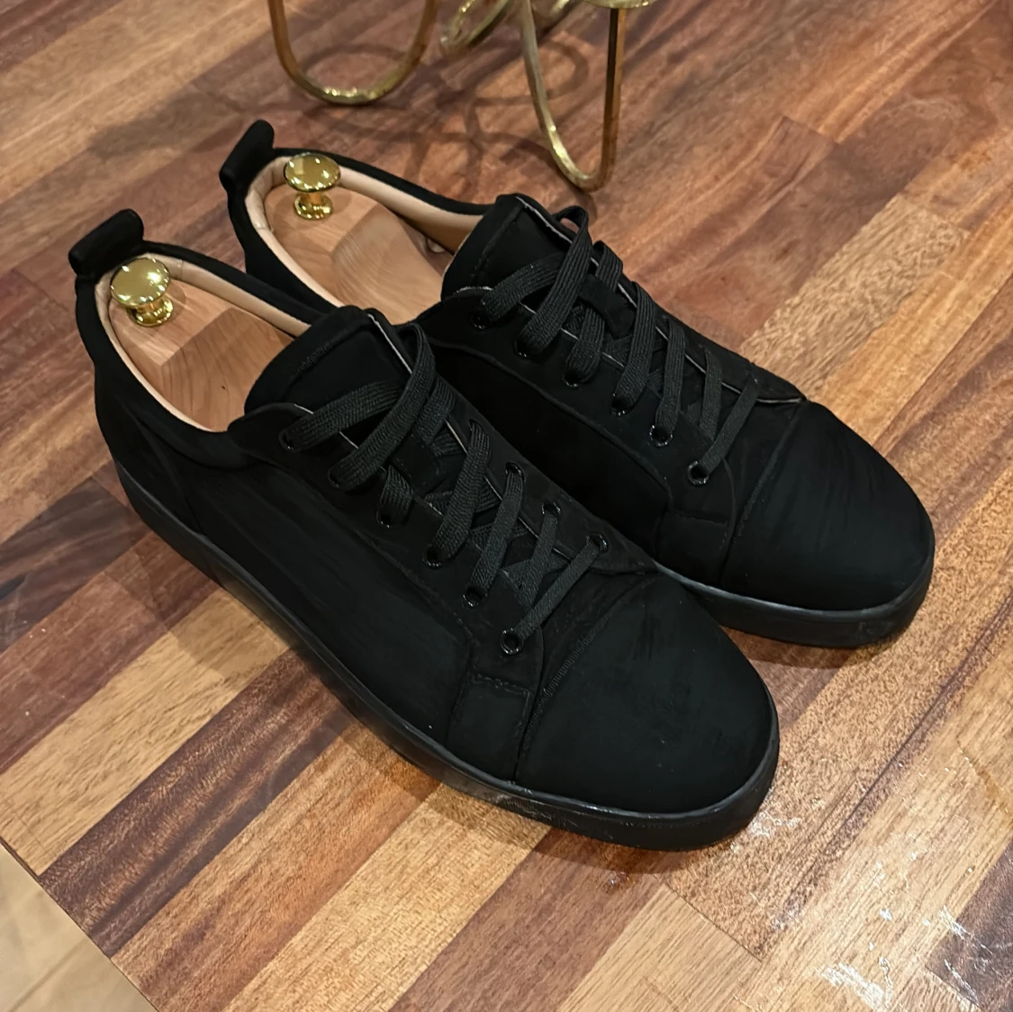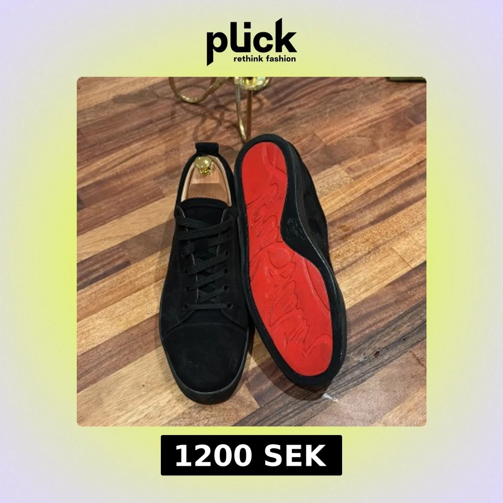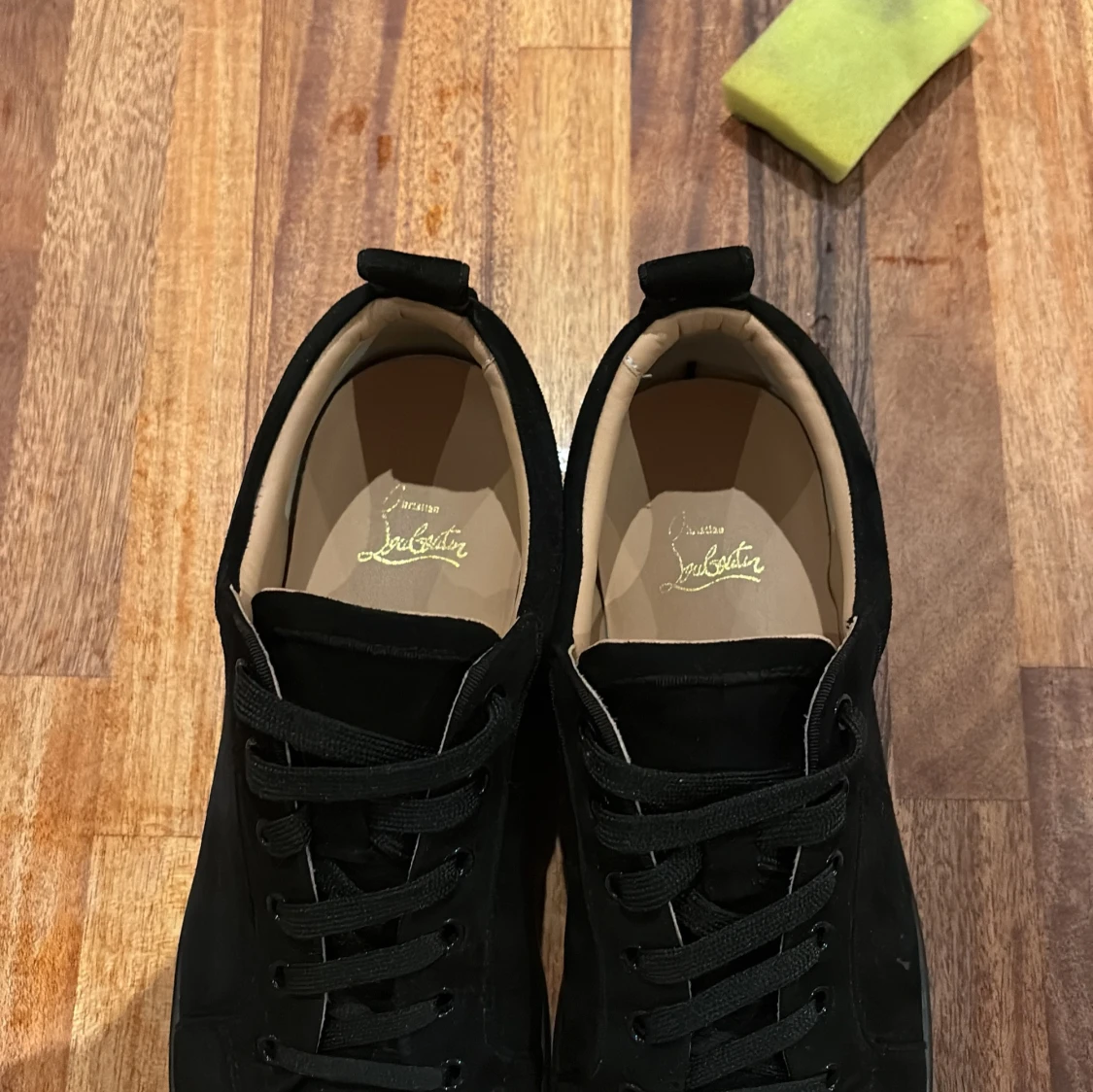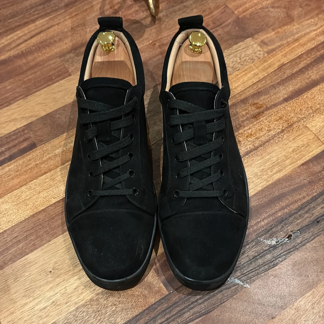Snygga svarta sneakers från Christian Louboutin i mocka med klassisk röd sula. Skorna har rund tå, svarta skosnören och diskret branding på insidan. Perfekta för dig som vill ha en clean och lyxig look med en ikonisk touch. Kommer med kvitto!