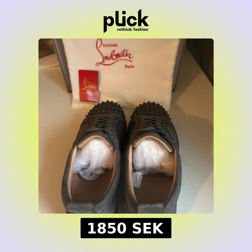 Säljer ett par grå sneakers från Christian Louboutin i mocka med coola nitar på tån. Skorna har snörning och en platt sula, perfekt för dig som vill sticka ut med en edgy vibe. Klassisk rund tå och exklusiv känsla, passar till allt från jeans till dressade outfits.