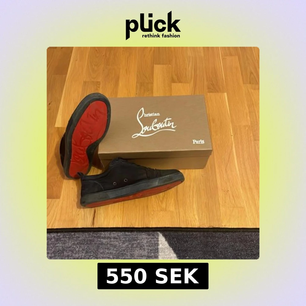 Säljer ett par svarta sneakers från Christian Louboutin med ikonisk röd sula och snörning. Skorna har en rund tå och är tillverkade i skinn med en mjuk beige insida. Kommer med originalkartong och tillbehör. Perfekt för dig som gillar lyxiga detaljer.