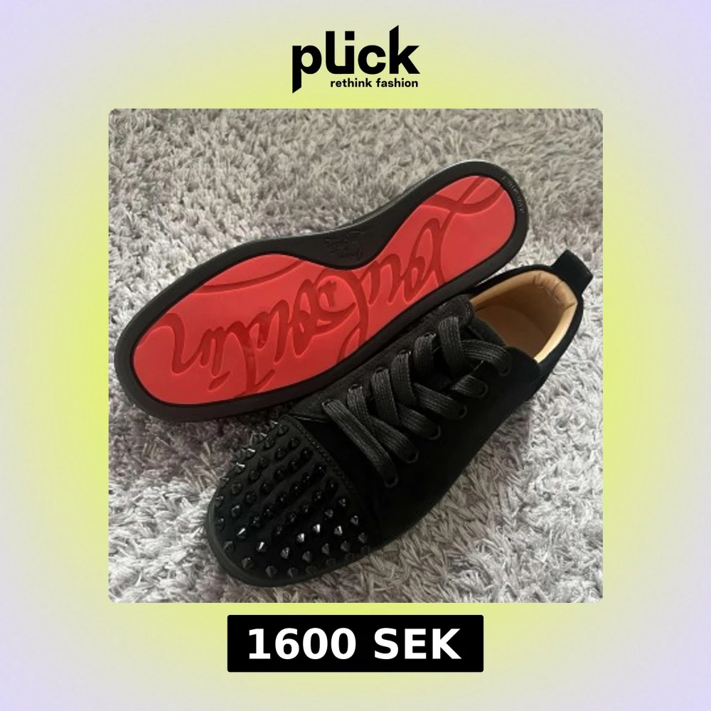Säljer ett par svarta sneakers från Christian Louboutin med ikonisk röd sula och svarta nitar på tån. Skorna har snörning, rund tå och är tillverkade i mocka med läderdetaljer. Kommer med originalkartong, dustbag och äkthetskort.