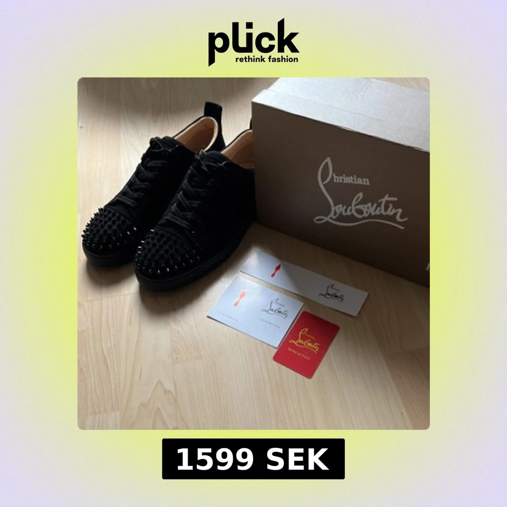 Säljer ett par svarta sneakers från Christian Louboutin med svarta nitar på tån och klassisk röd sula. Skorna har snörning och är tillverkade i mocka med detaljer i skinn. Perfekta för dig som vill sticka ut med en edgy stil.