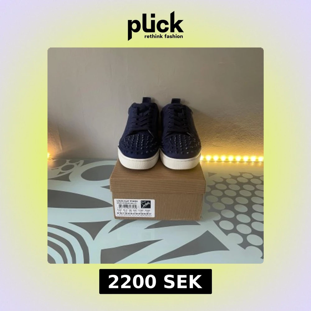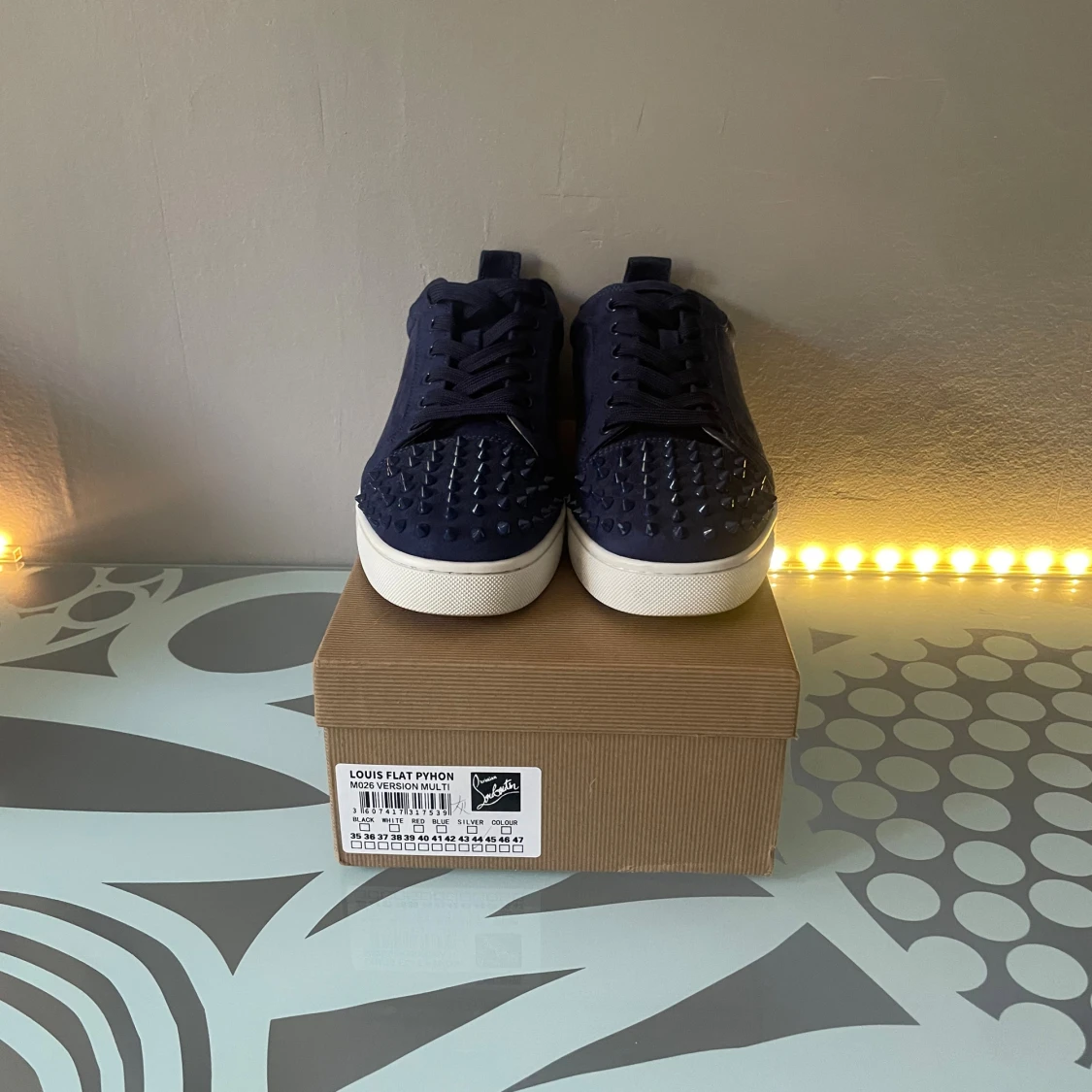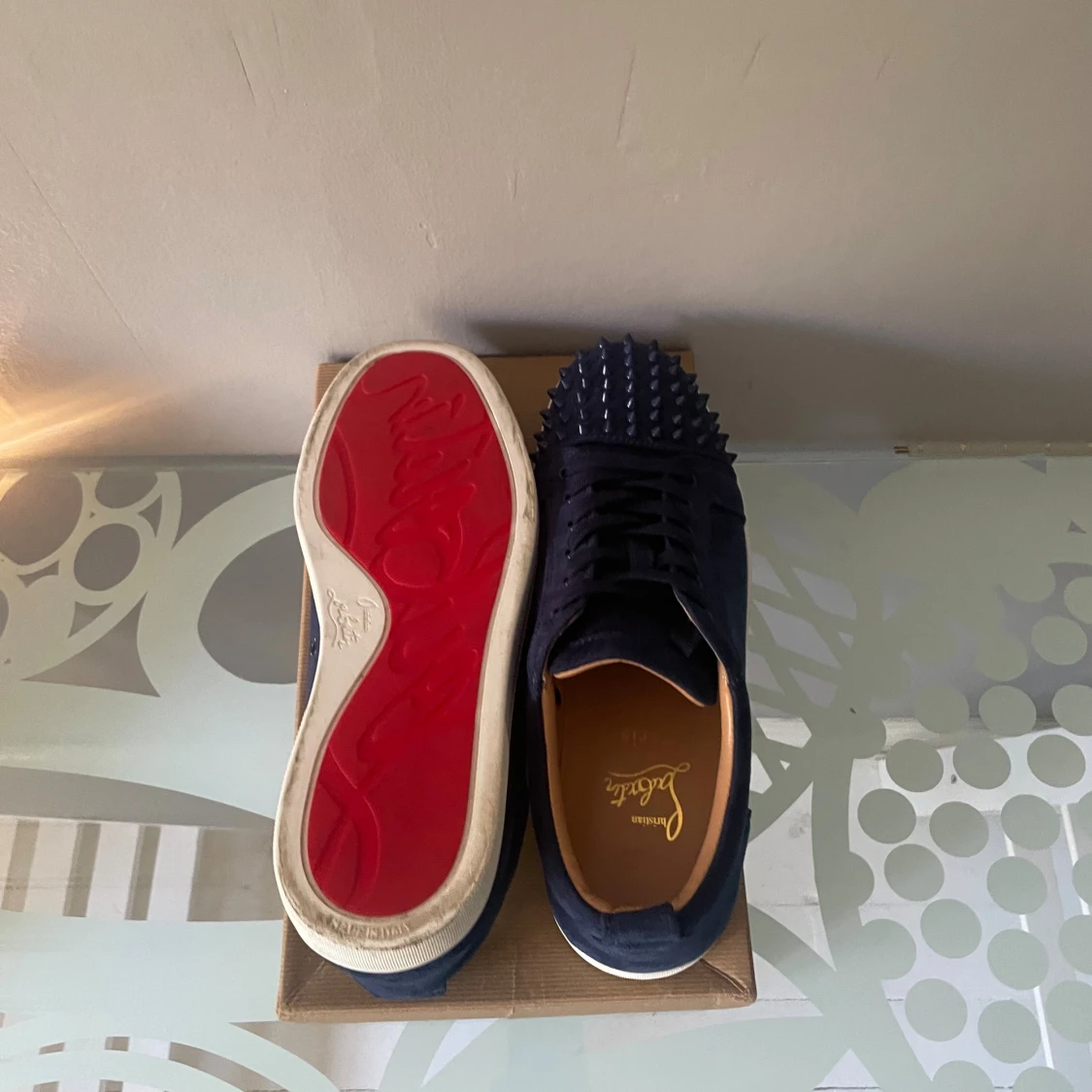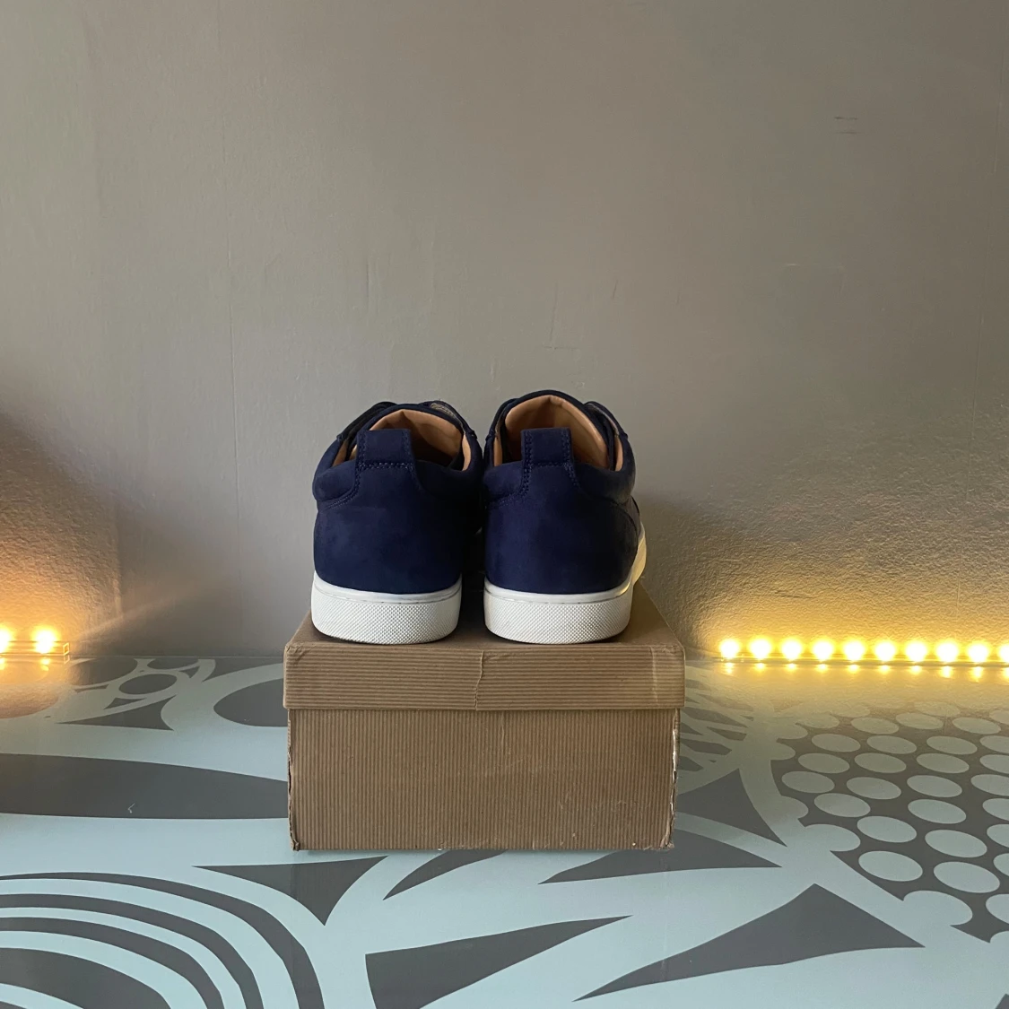 Säljer ett par mörkblå Christian Louboutin sneakers i mocka med coola nitar på tån och klassisk röd sula. Skorna har snörning och vit platt sula, och kommer med originalkartong och dustbag. Perfekt för dig som vill sticka ut med exklusiva detaljer.