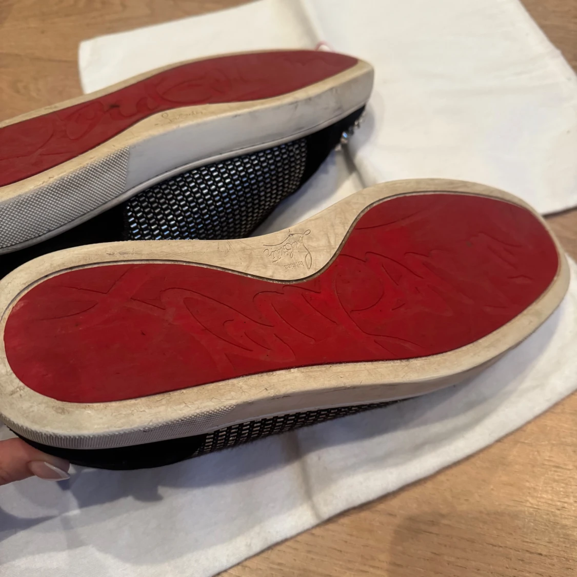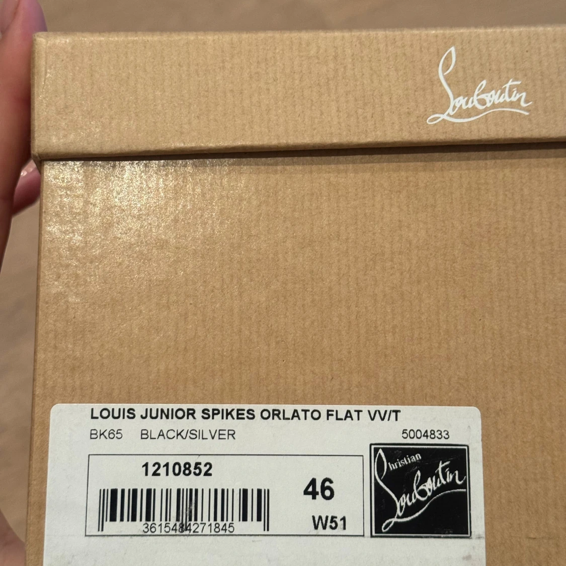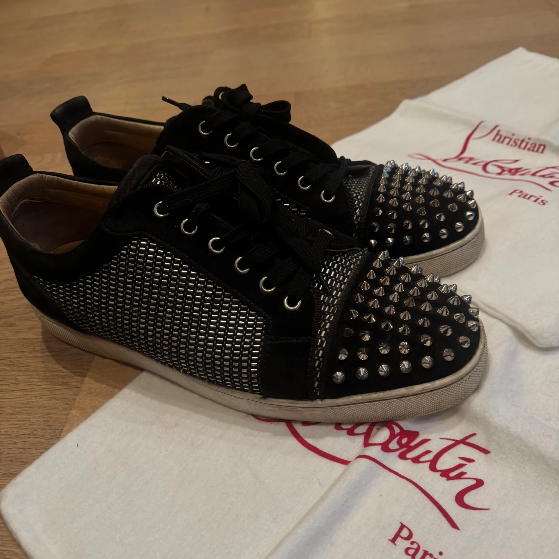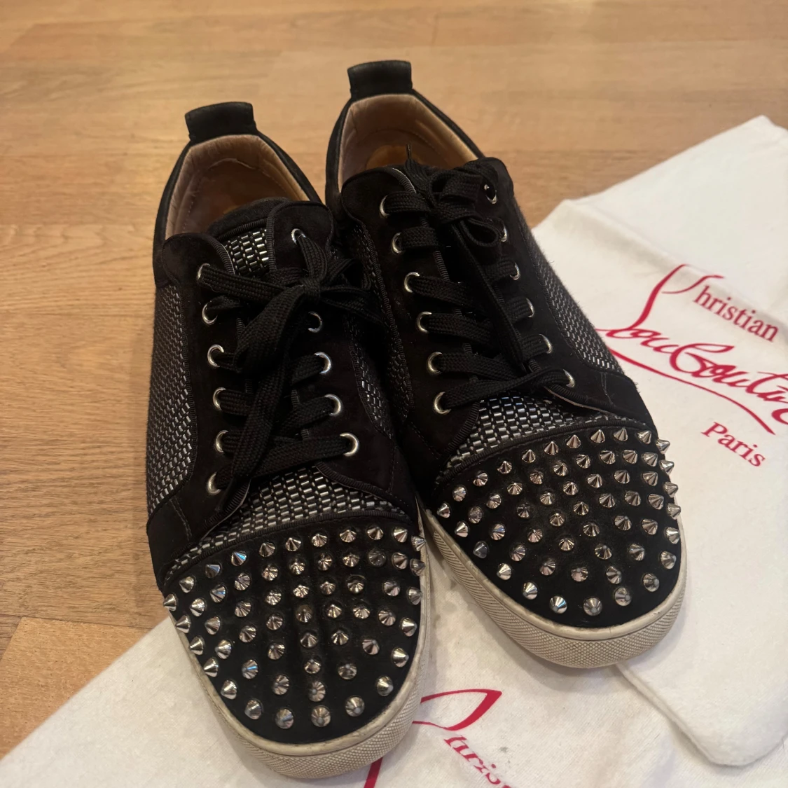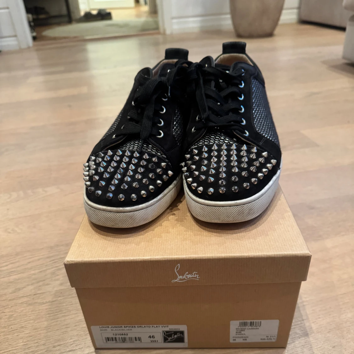 Snygga svarta Louis Junior Spikes från Christian Louboutin med röda sulor. Skorna har silverfärgade nitar på tån, mesh-detaljer på sidorna och svarta mockapartier. Dustbags till båda skorna samt orginalkartong tillkommer.