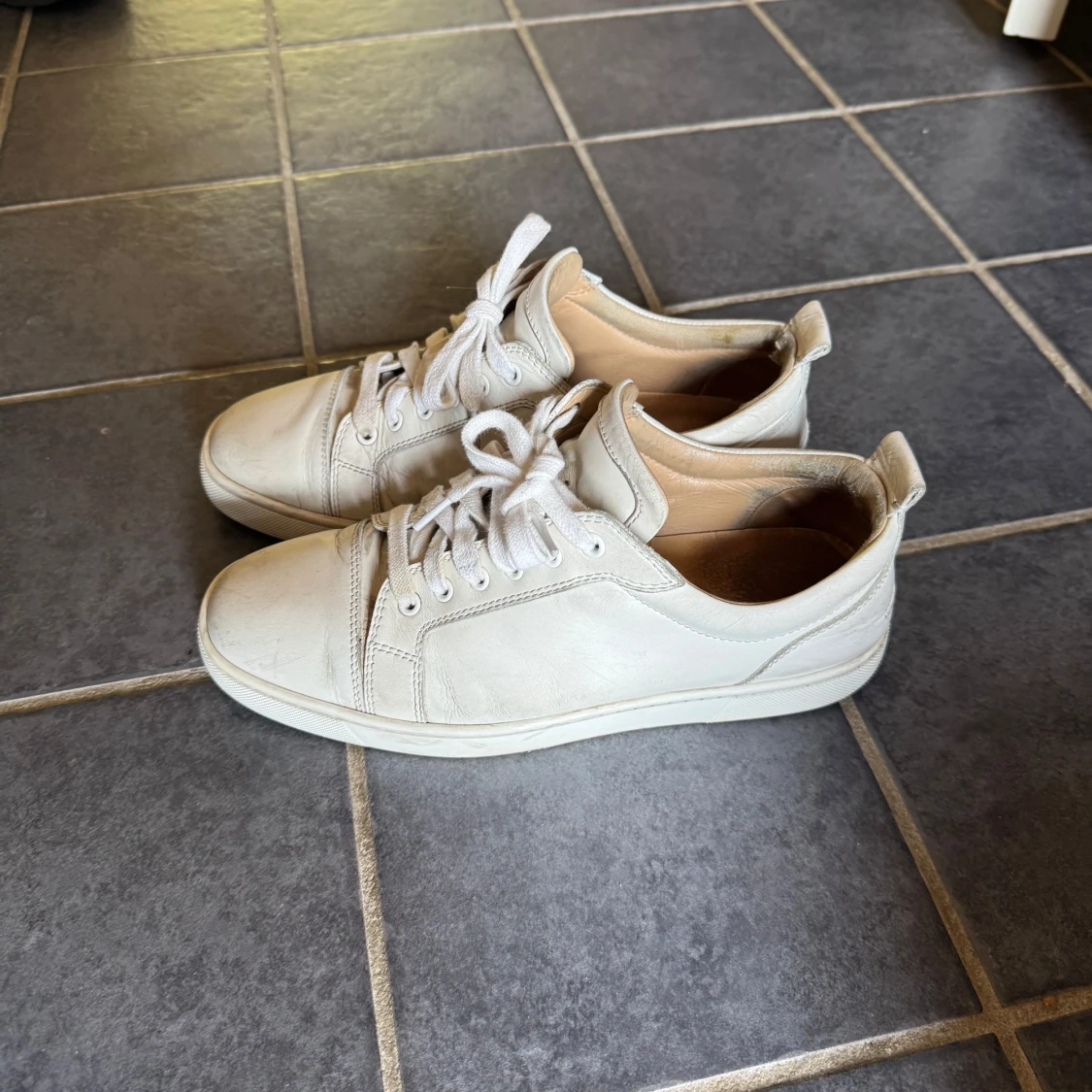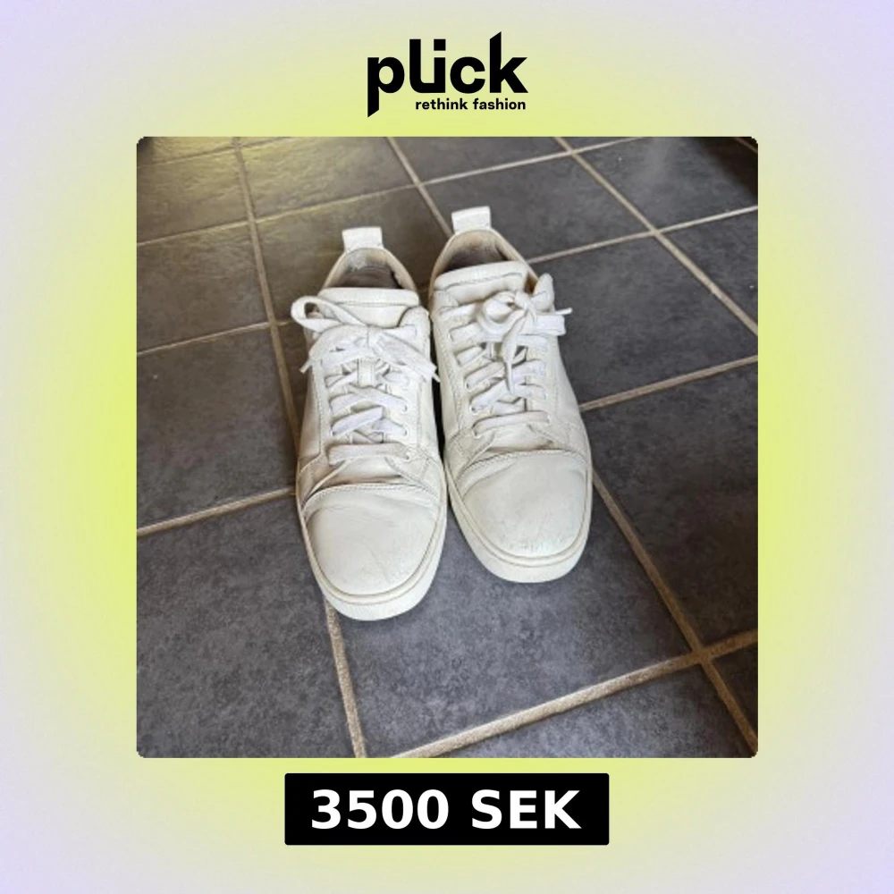 Snygga vita sneakers från Christian Louboutin i skinn med klassiska röda sulor och snörning. Stilren design med rund tå och platt sula, perfekta för dig som vill ha en clean look med en lyxig touch. Kvitto finns.