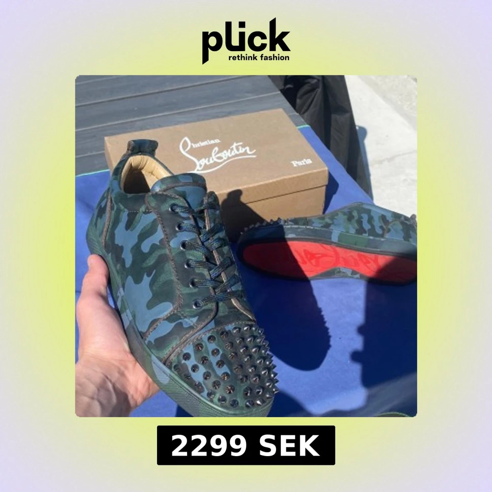 Ett par unika loubs med camo färg✌️🤩 bytes mot ett par flycrews innan vad jag fick höra. Tappade tyvärr bort extra spikarna. Skorna är i nyskick riktigt fint skick👌 har tagits väl hand om🤝