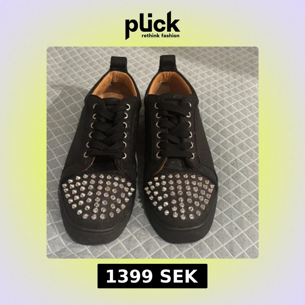 Christian Louboutin skor med glittrande ovandel i mocka och silverfärgade nitar på tån. Skorna har klassisk röd sula, svarta skosnören och läderfoder. Skriv för fler frågor eller bilder i chatten tack!