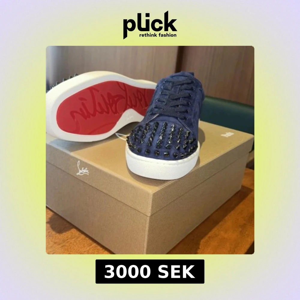 Snygga blå sneakers från Louboutin i mocka med svarta nitar på tån och klassisk röd sula. Skorna har vita sulor, snörning och en riktigt lyxig vibe. Perfekta för dig som vill sticka ut med exklusiva detaljer och streetstyle-känsla.