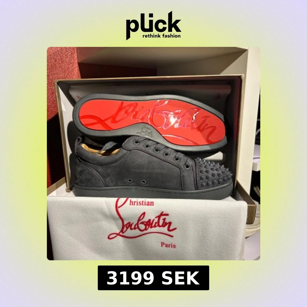 Snygga grå sneakers i mocka från Christian Louboutin med den ikoniska röda sulan. Skorna har snörning och är dekorerade med nitar på tån för en edgy look. Perfekta för dig som vill sticka ut med stil.OBS! Priset är inte hugget i sten. Hör av er vid minsta fundering 🍾