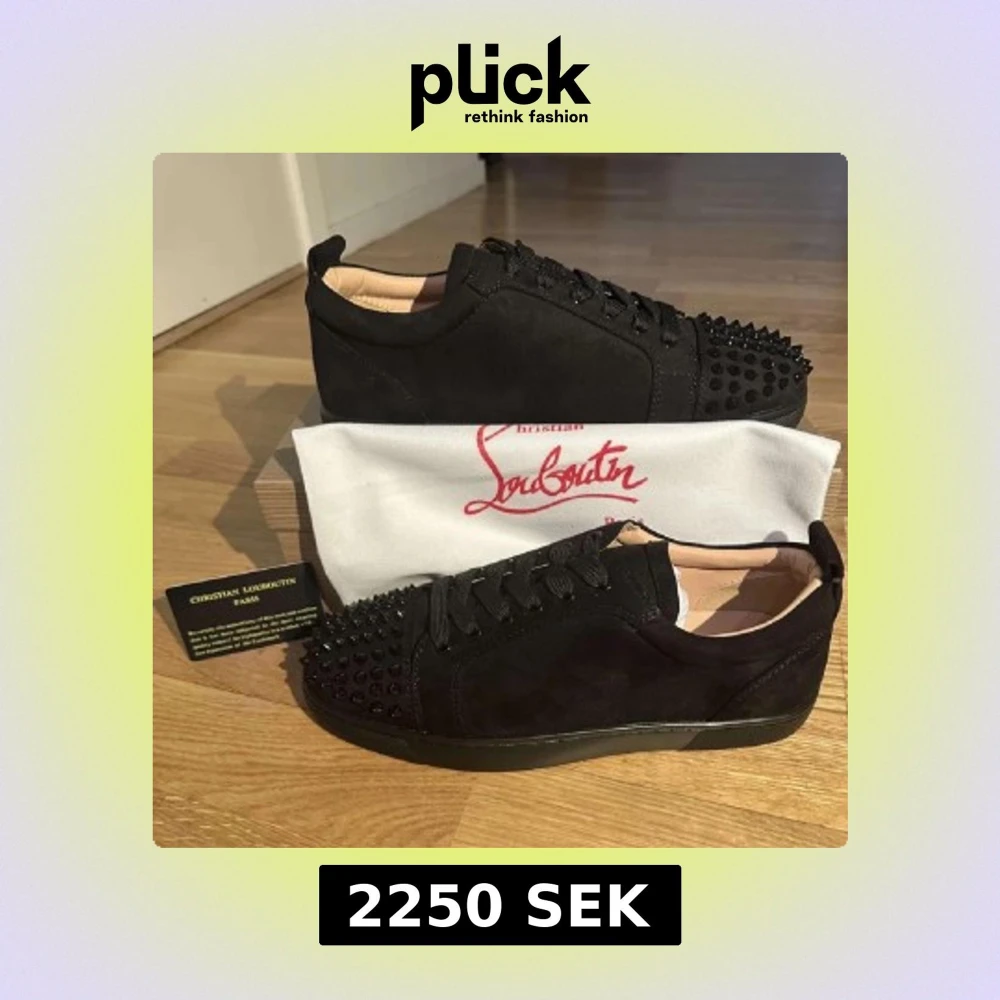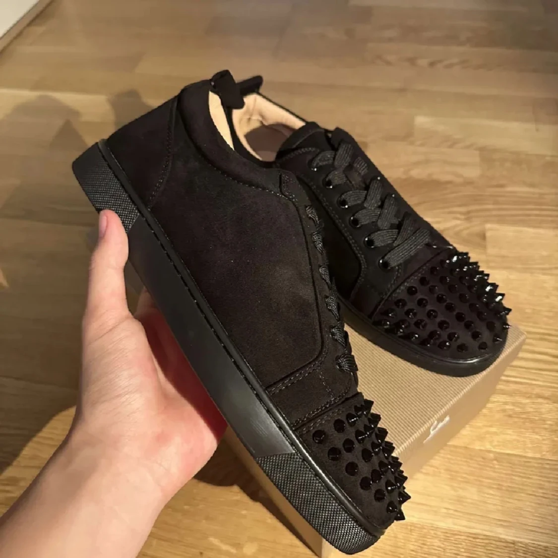 Snygga svarta sneakers från Christian Louboutin med nitar på tån och snörning. Tillverkade i mocka för en lyxig känsla. Perfekta för att ge din outfit en edgy touch.