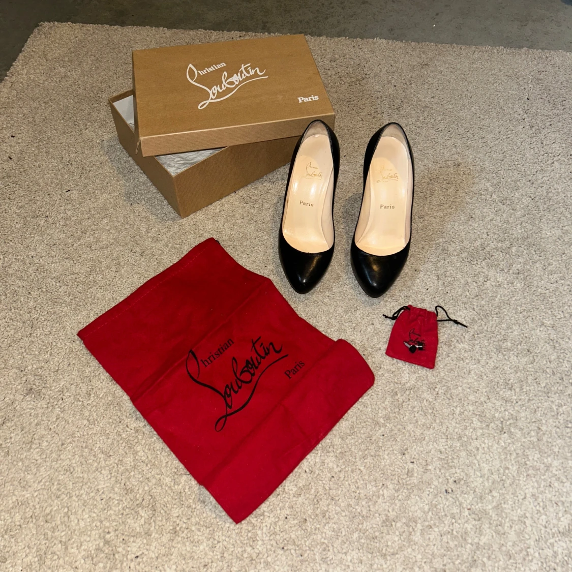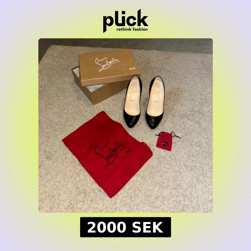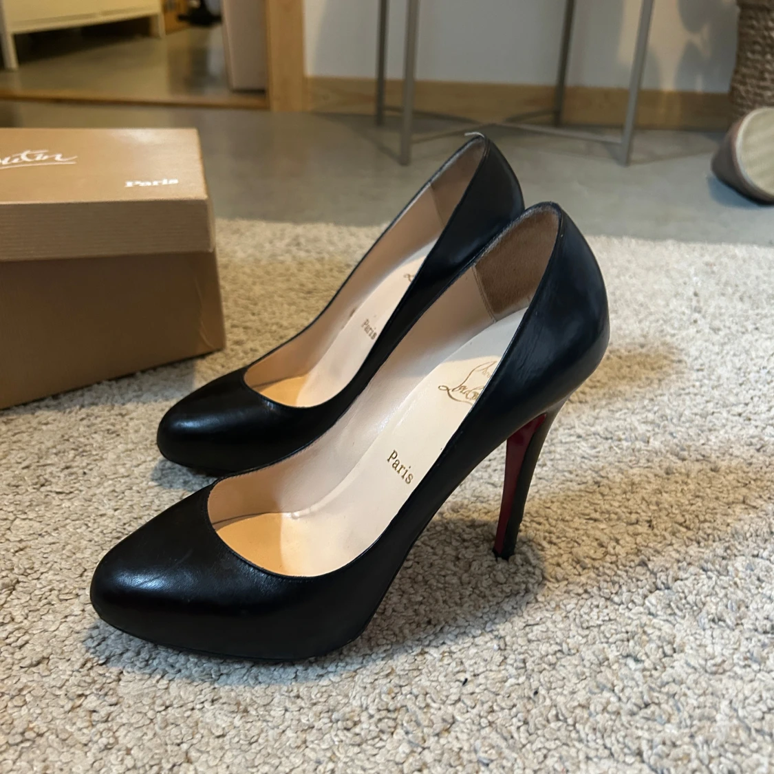 Väldigt fina Louboutins Declic 120. Köpta för 6000 kr. Ett par extra klackar medföljer samt en dustbag. Bruksslitage syns men inget som påverkar skorna.