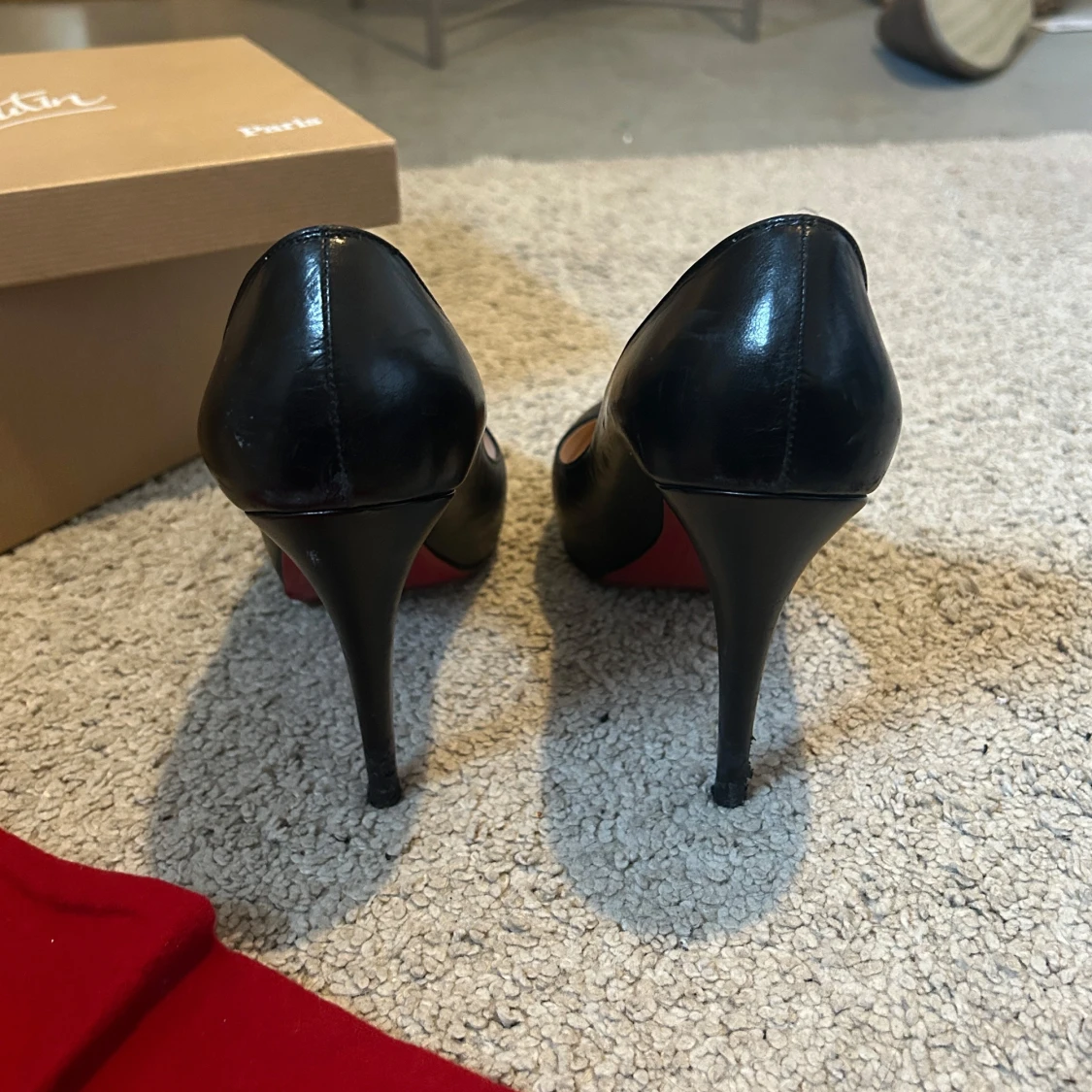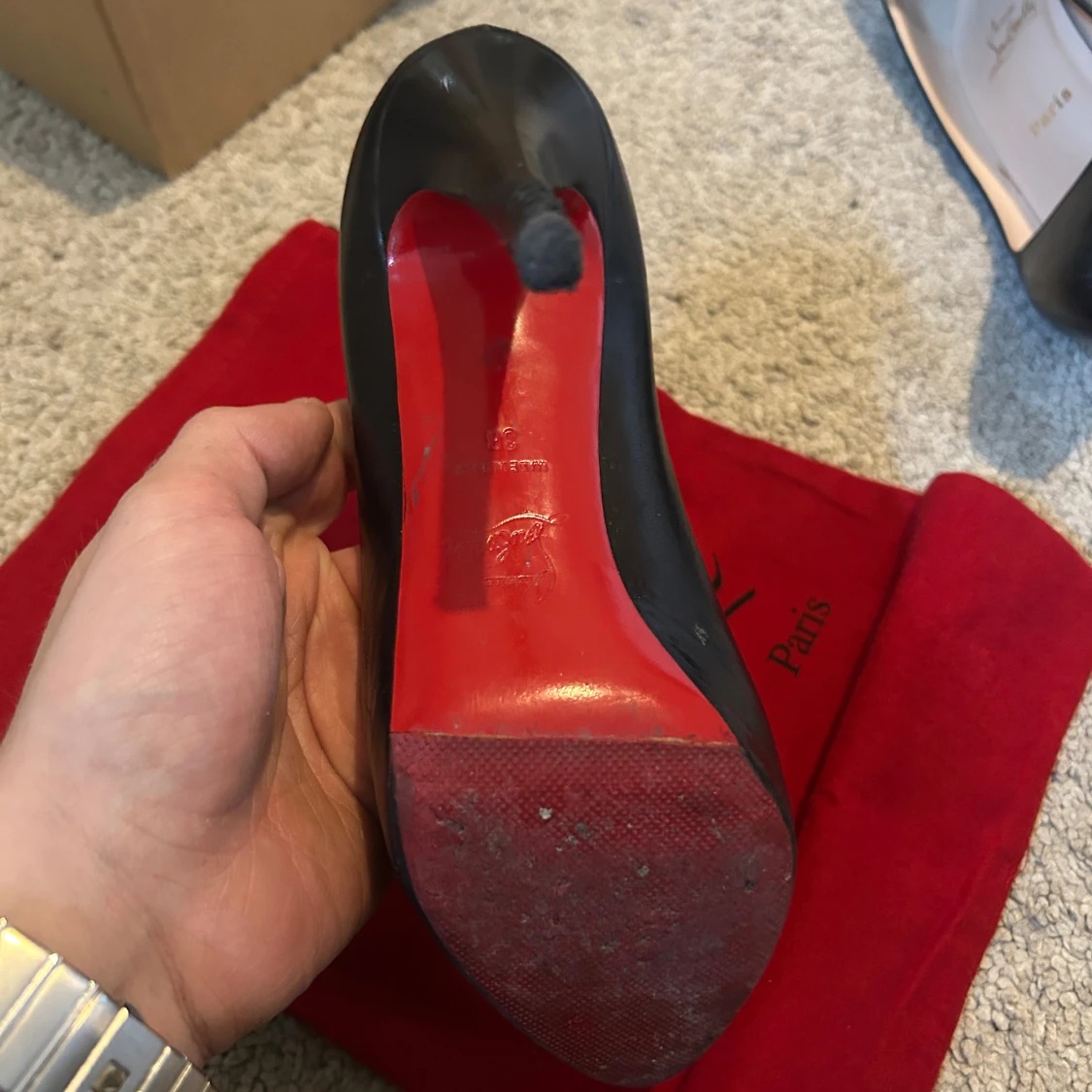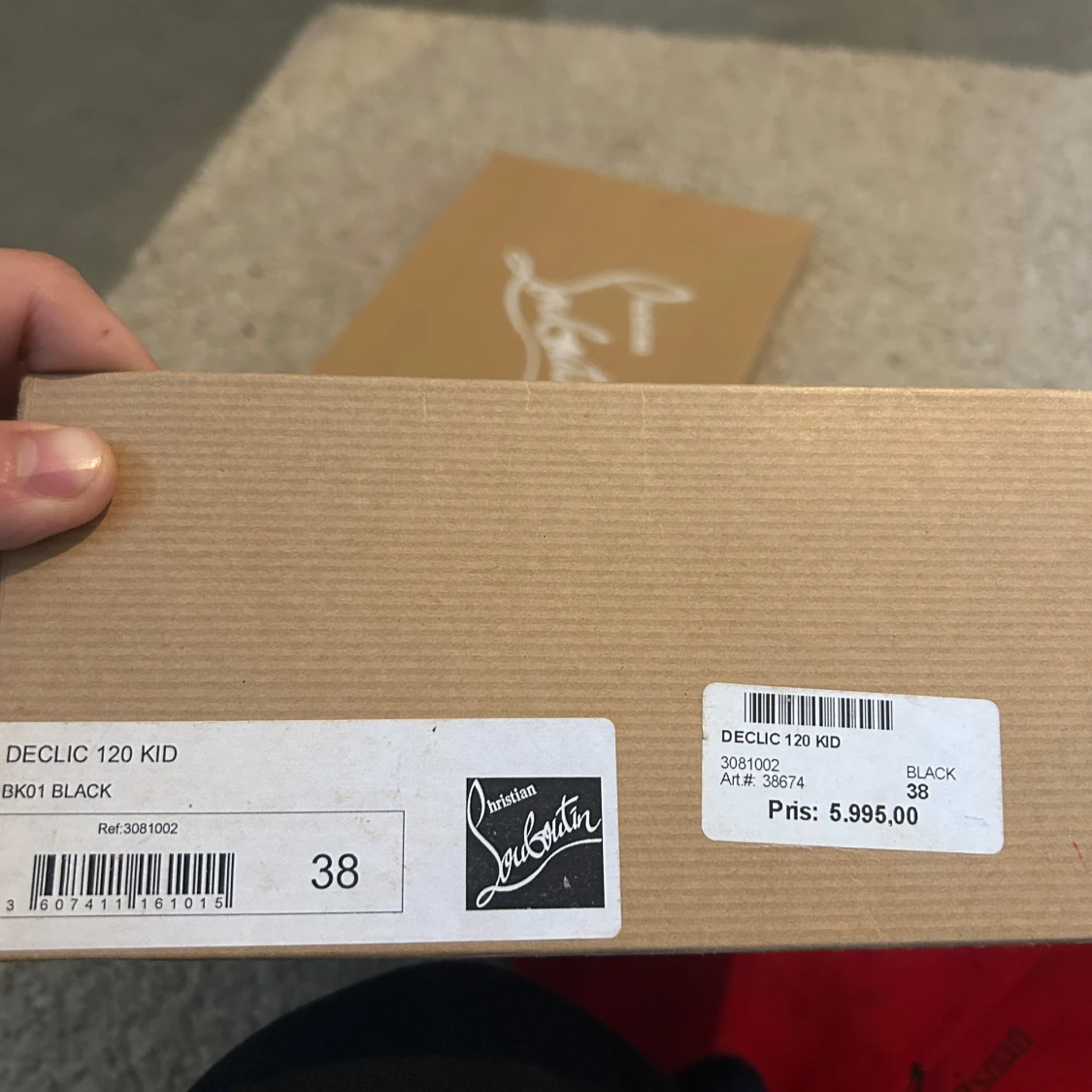 Väldigt fina Louboutins Declic 120. Köpta för 6000 kr. Ett par extra klackar medföljer samt en dustbag. Bruksslitage syns men inget som påverkar skorna.