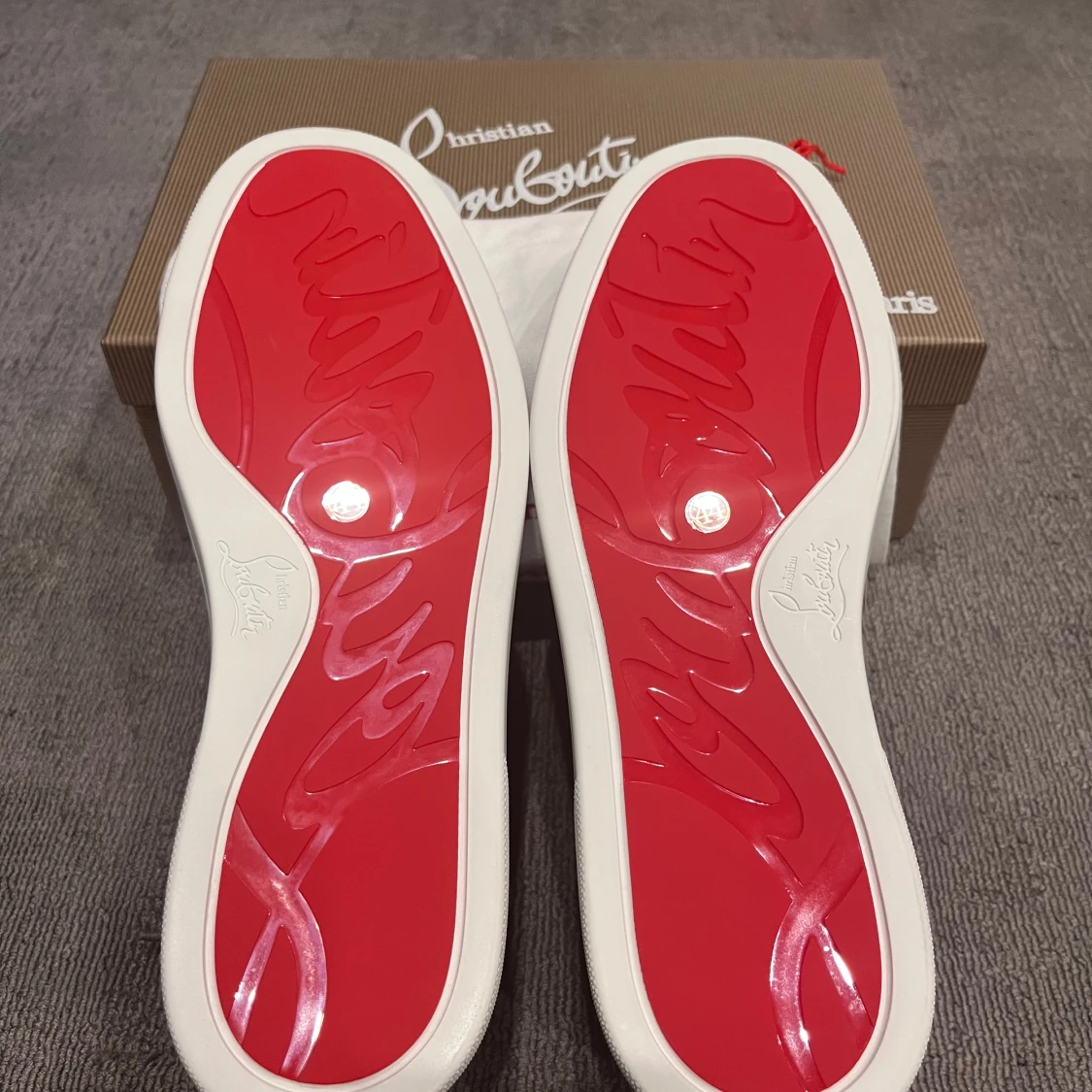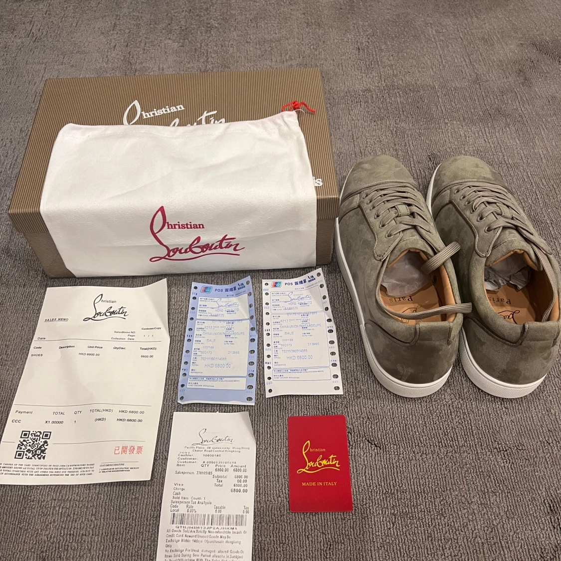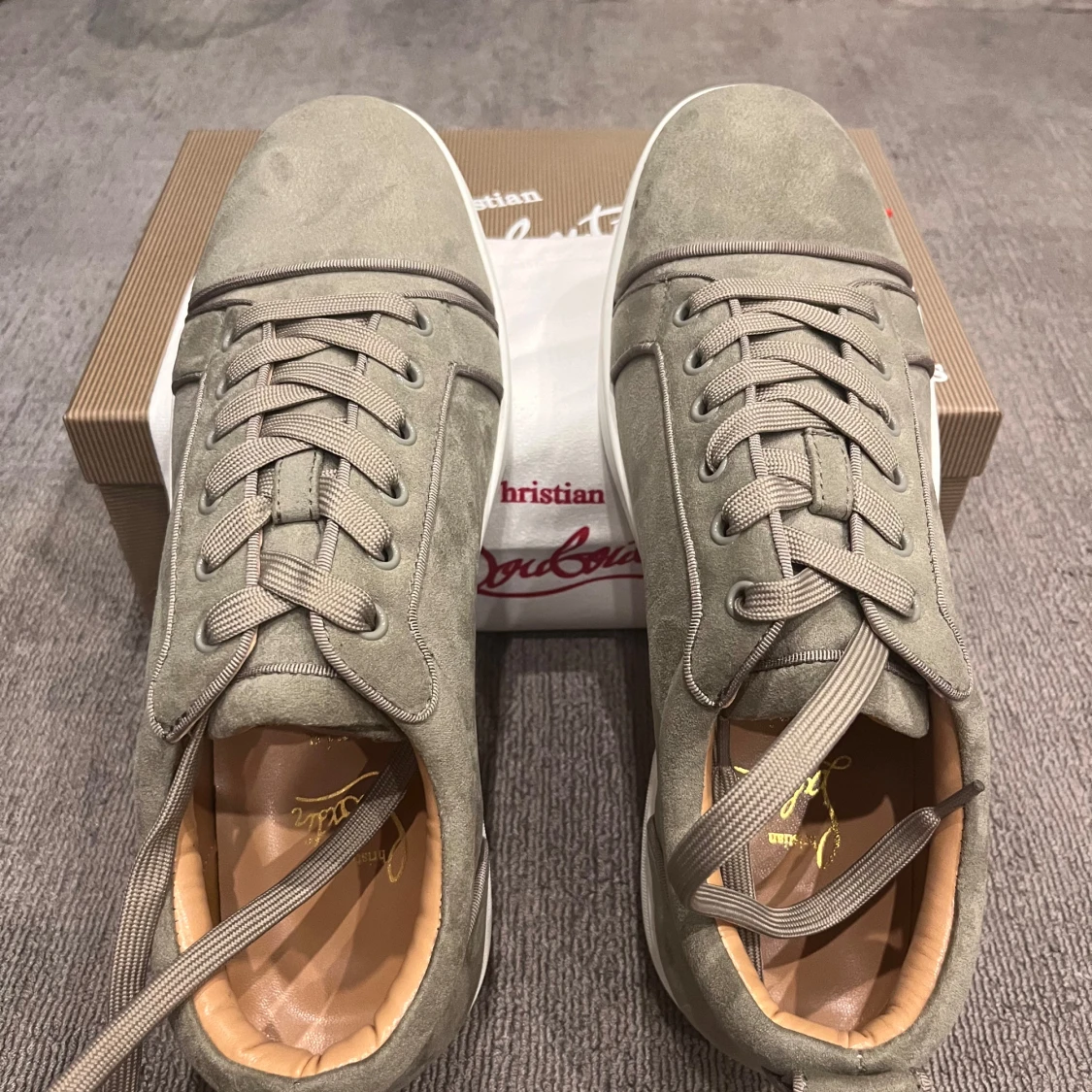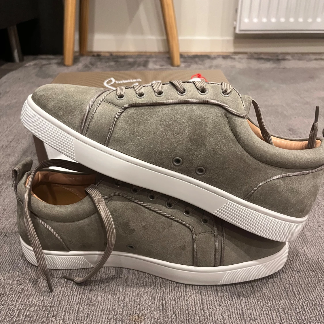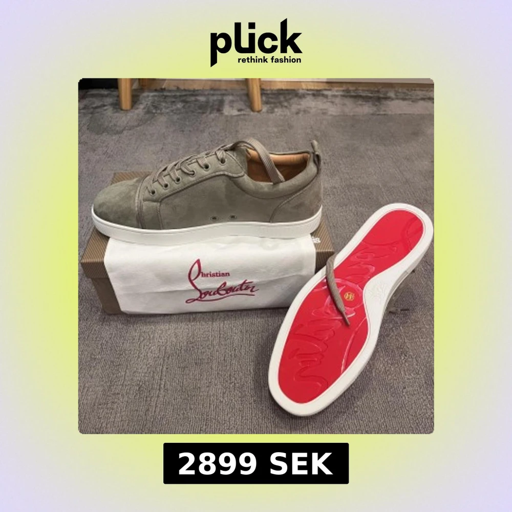 Snygga grå skor från Christian Louboutin i mjuk mocka med klassisk röd signatursula. Skorna har rund tå, platt vit sula och matchande grå snörning. Insidan är lyxigt fodrad i beige läder och detaljerna är stilrena och minimalistiska. Perfekt för dig som gillar exklusiv streetstyle. skorna är använda 2 gånger samt så är bilderna inte nuverande skicket men det är nära