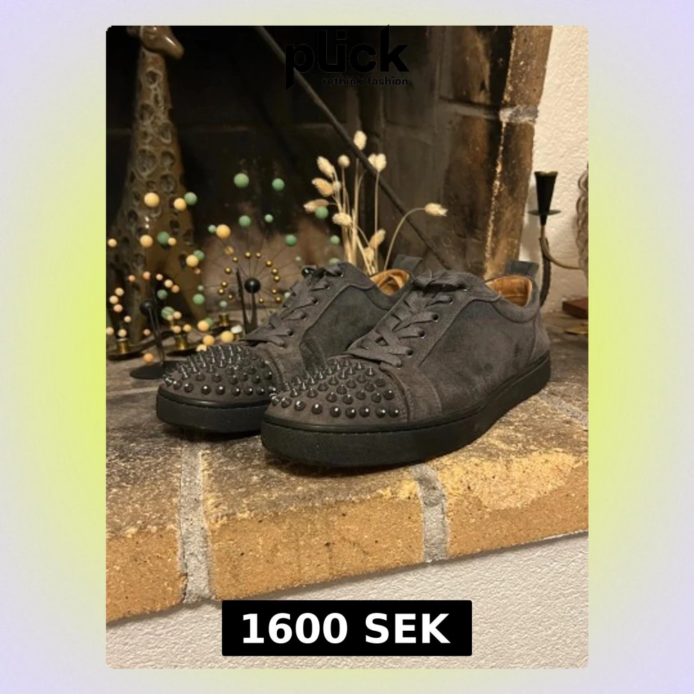 Säljer ett par gråa sneakers från Christian Louboutin i mocka med coola svarta nitar på tån och klassisk röd sula. Skorna har snörning och en rund tå, samt en platt sula. Insidan är beige och de har en riktigt edgy vibe som sticker ut.