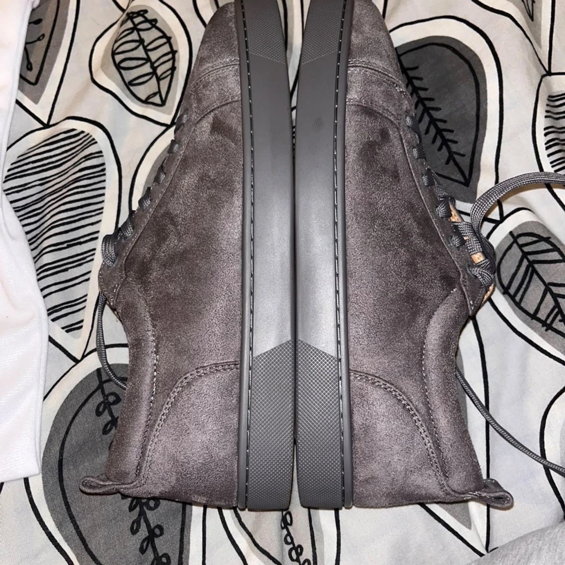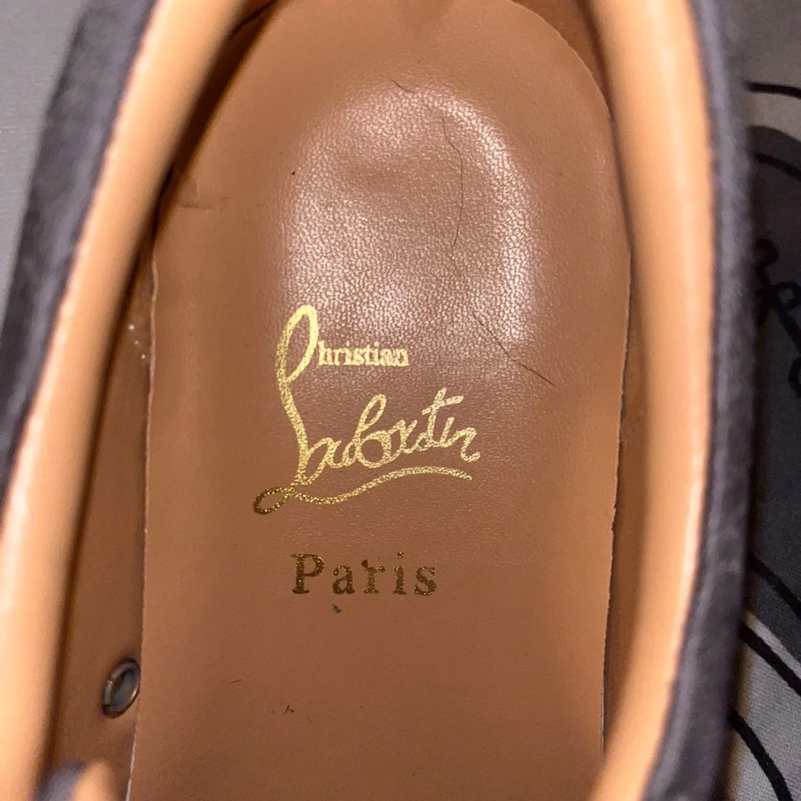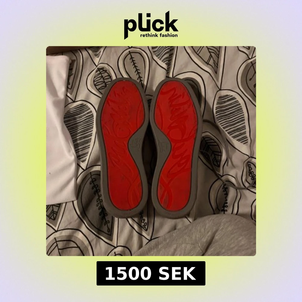 Säljer ett par exklusiva sneakers från Christian Louboutin i grå mocka med ikonisk röd sula. Skorna har snörning, rund tå och platt sula. Kommer med originalpåse, box och kvitton. Perfekta för dig som vill sticka ut med lyxig streetstyle.